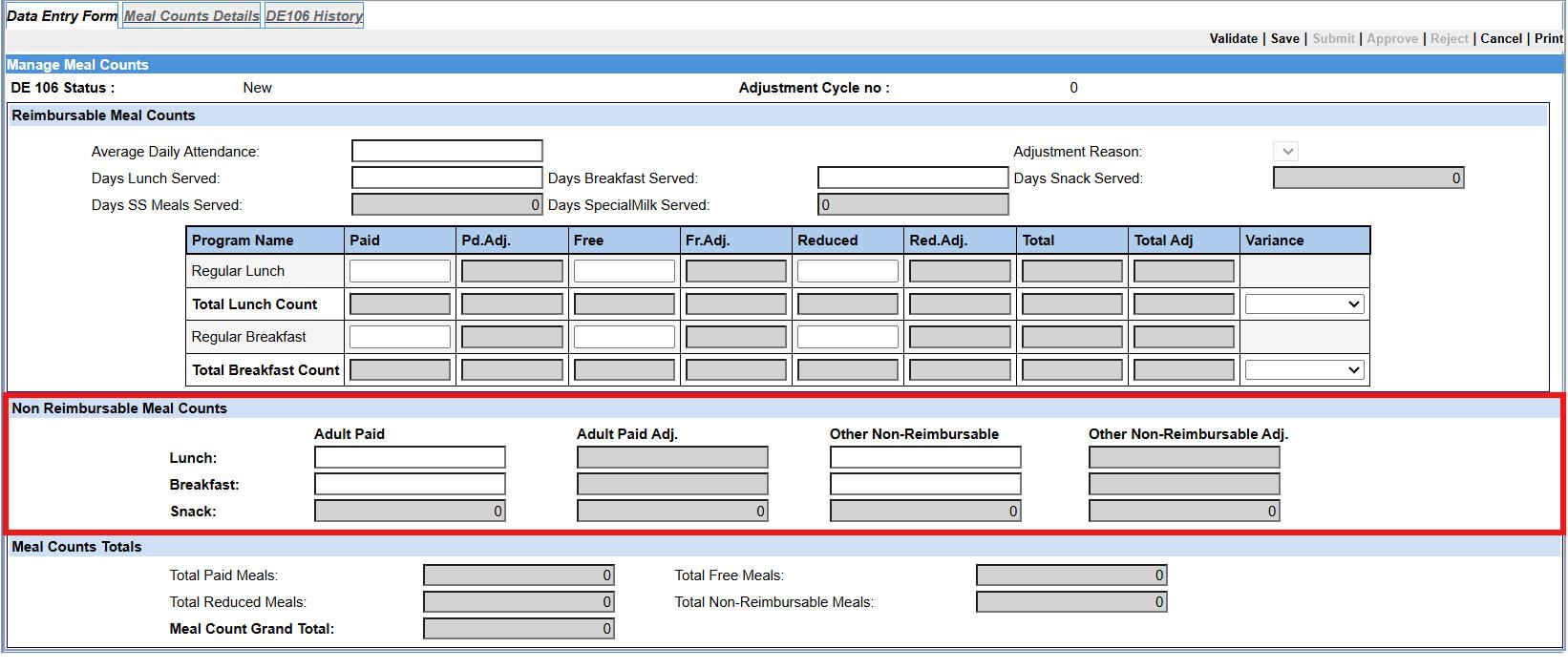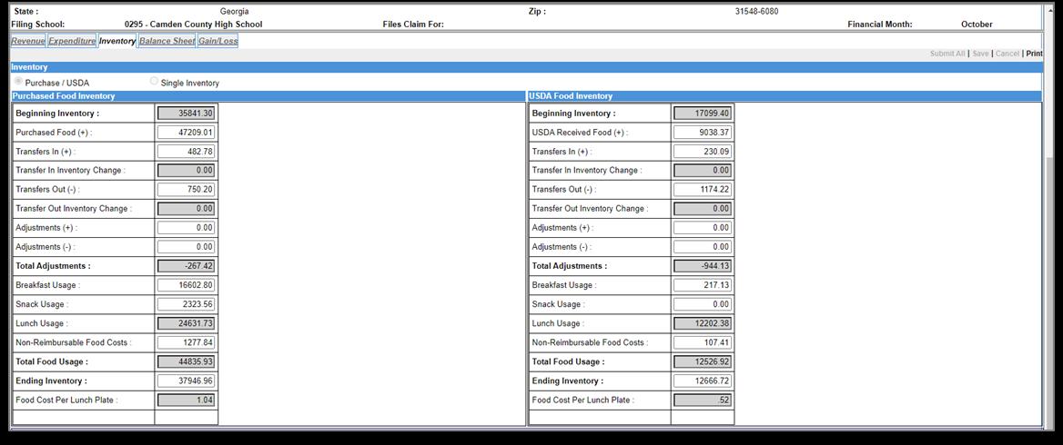 If single inventory is selected in the School Approval Module (SAM) in SNO, the USDA food inventory fields will be “grayed” out and not available for data entry. For Single Inventory, USDA information should be combined with purchased and entered in the purchased inventory fields.