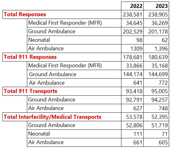 The 2023 EMS Annual Report from the Office of EMS and Trauma is an overview of EMS data that provides an operating report, organization description, and basic statistical data of Emergency Medical Services (EMS) in Georgia. The contents of the report correspond with the regulatory records of the Georgia Office of EMS and Trauma, Division of Health Protection, Department of Public Health. The statistical data represented in the tables and charts was collected from the Patient Care Reports and other operating data from January 1, 2023, through December 31, 2023. The statistics in this document will provide a baseline for continuous examination, comparison, and improvements of the Georgia EMS operations statewide.