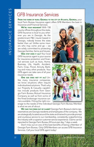 GFB Insurance Services From the farms of rural Georgia to the city of Atlanta, Georgia, your local Farm Bureau Insurance agent offers GFB Members the best in Insurance and Financial Services. We’re your neighbor! With 158 county offices throughout the state, GFB Insurance is local to you wherever you are in Georgia. As the predominant P&C insurer based in Georgia, nobody knows the state better than us! Unlike some insurers who may come and go – we are solely committed to protecting Georgia families, farms and futures. One stop does it all! Your local GFB Insurance agent is your source for insurance protection and financial services such as Auto, Home, Business, Life, Health, Accident, Farm, Crop, Flood, Annuity, Banking and many other products. Your GFB agent can take care of all your insurance needs. One size does not fit all! Unlike many insurance companies, we know situations often require individualized solutions. That’s why our Property & Casualty capabilities include products from Georgia Farm Bureau Mutual Insurance Company as well as from some of the finest brokerage insurance carriers available. Fitting the right coverage to the needs of the individual Georgia Farm Bureau Member is what we are all about. We take the stress out of claims! Georgia Farm Bureau’s claims representatives are Georgia residents and employees of the company. We are strategically located around the state and trained to provide prompt and courteous service to our membership, consistently outperforming the industry with a superior customer service experience. Claims can be reported to Georgia Farm Bureau 24 hours per day, 7 days a week. Don’t miss out on one of the best benefits of being a Member of Georgia Farm Bureau. Only GFB Members can access GFB Insurance Services. Call Prices your and local GFB agent availability subjecttoday! to change without notice. 22