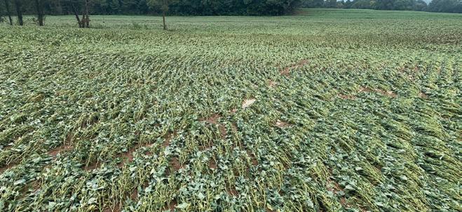 Meanwhile, Chattooga County farmer Garrett Hurley, who grows cotton and soybeans along with his father, Greg, lost about 50 acres of cotton, representing about 15% of the farm’s overall crop. The Hurleys had fields next to Racoon Creek and Perennial Creek, which come together to run into the Chattooga River. Garrett estimated the fields were under 12 feet of water. The plants in the soybean and cotton fields were submerged, laying them over; soil was washed away from the roots of the soybean plants.
