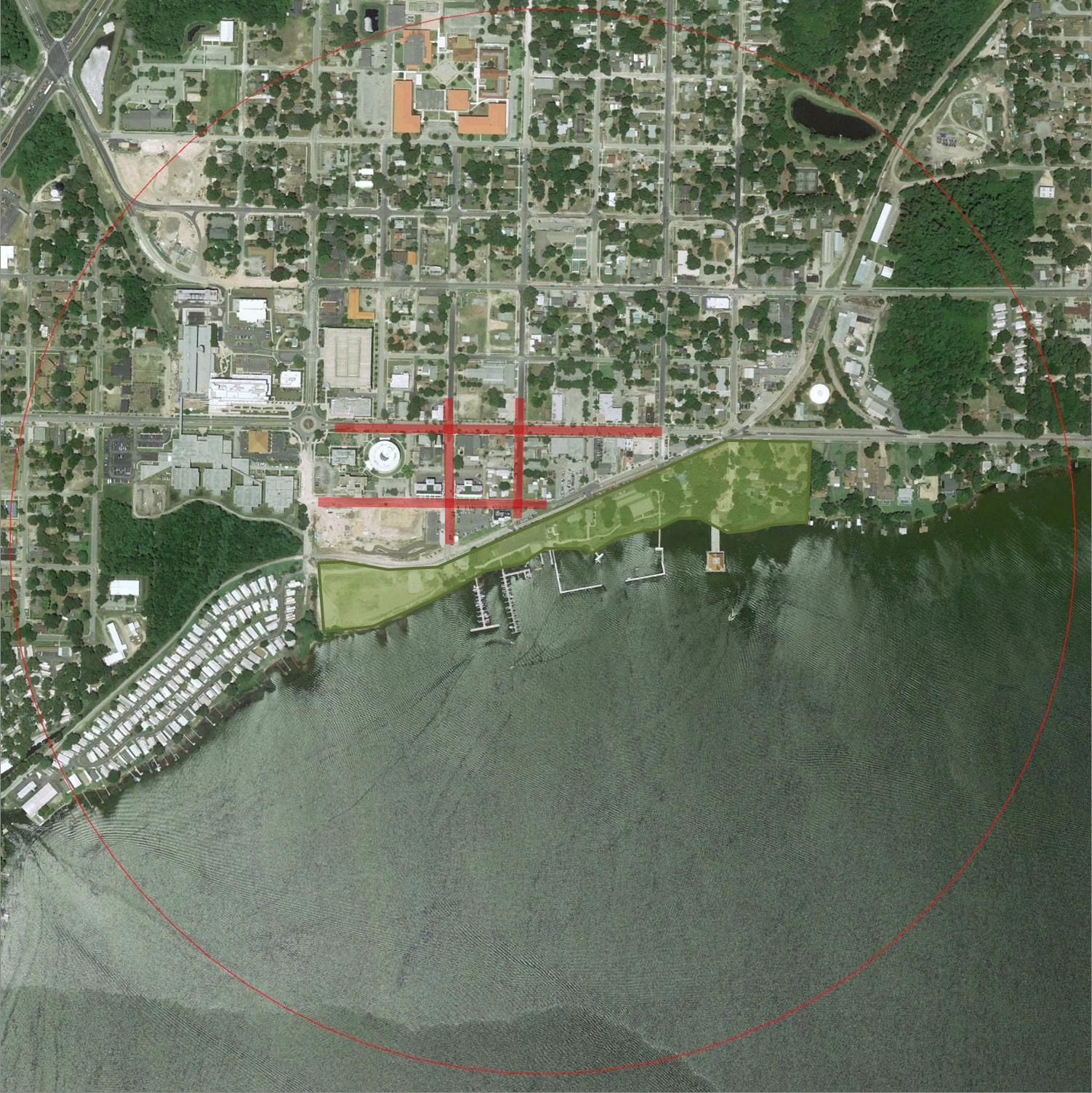 Eustis: The waterfront park is again proximate to downtown, which allows a strong relationship between downtown uses like shopping and restaurants and the lake amenity.