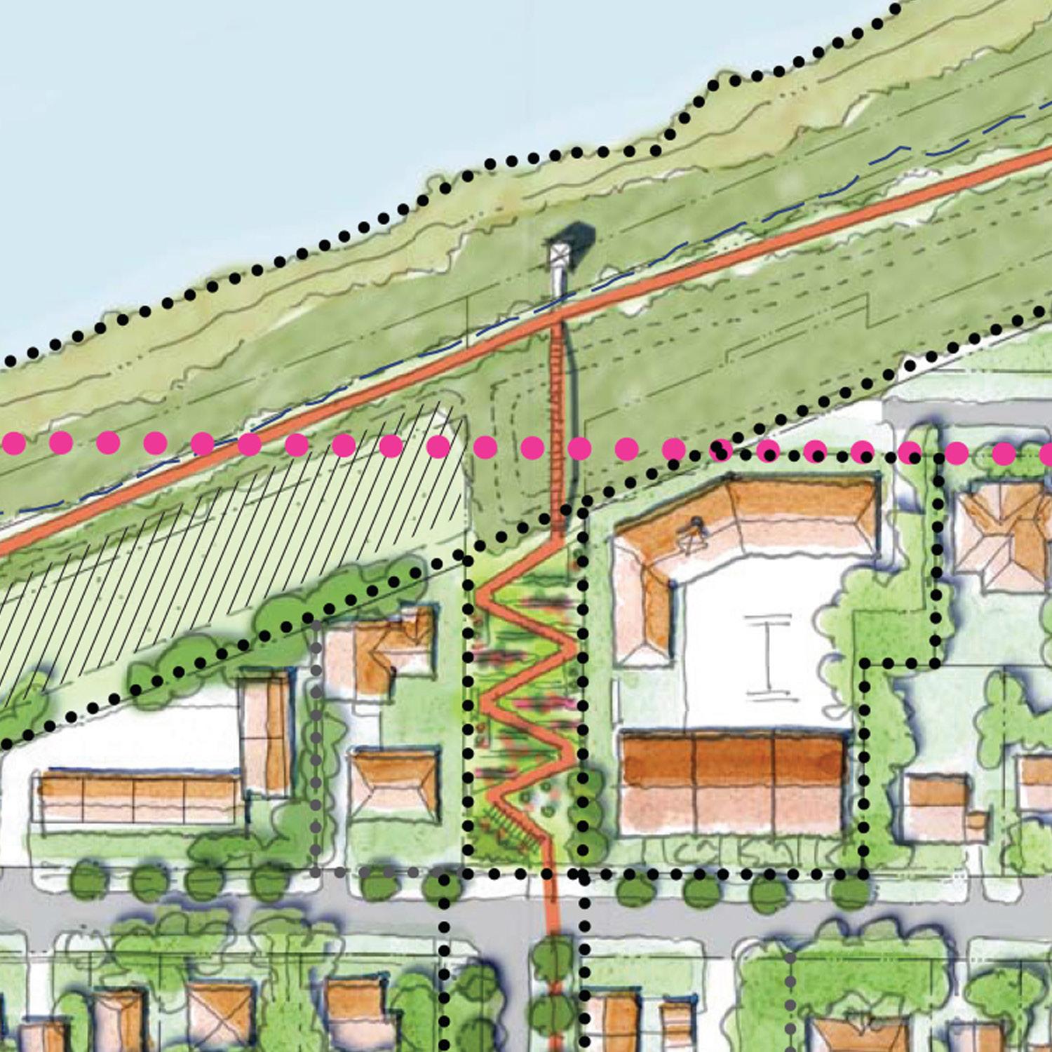 As the trail system is expanded away from the Lake Minneola waterfront into downtown and the closein neighborhoods, there is opportunity to make a connection at the end of Lake Avenue. In this location, steep topography has led to an unbuilt street right-ofway with the potential to carry a trail that connects to the proposed trail on Minneola Street. This trail would be configured in a “switchback” design to lessen the grade for all users and would conceptually contain a community garden space in between the switchbacks that is accessible from both uphill and downhill sides.