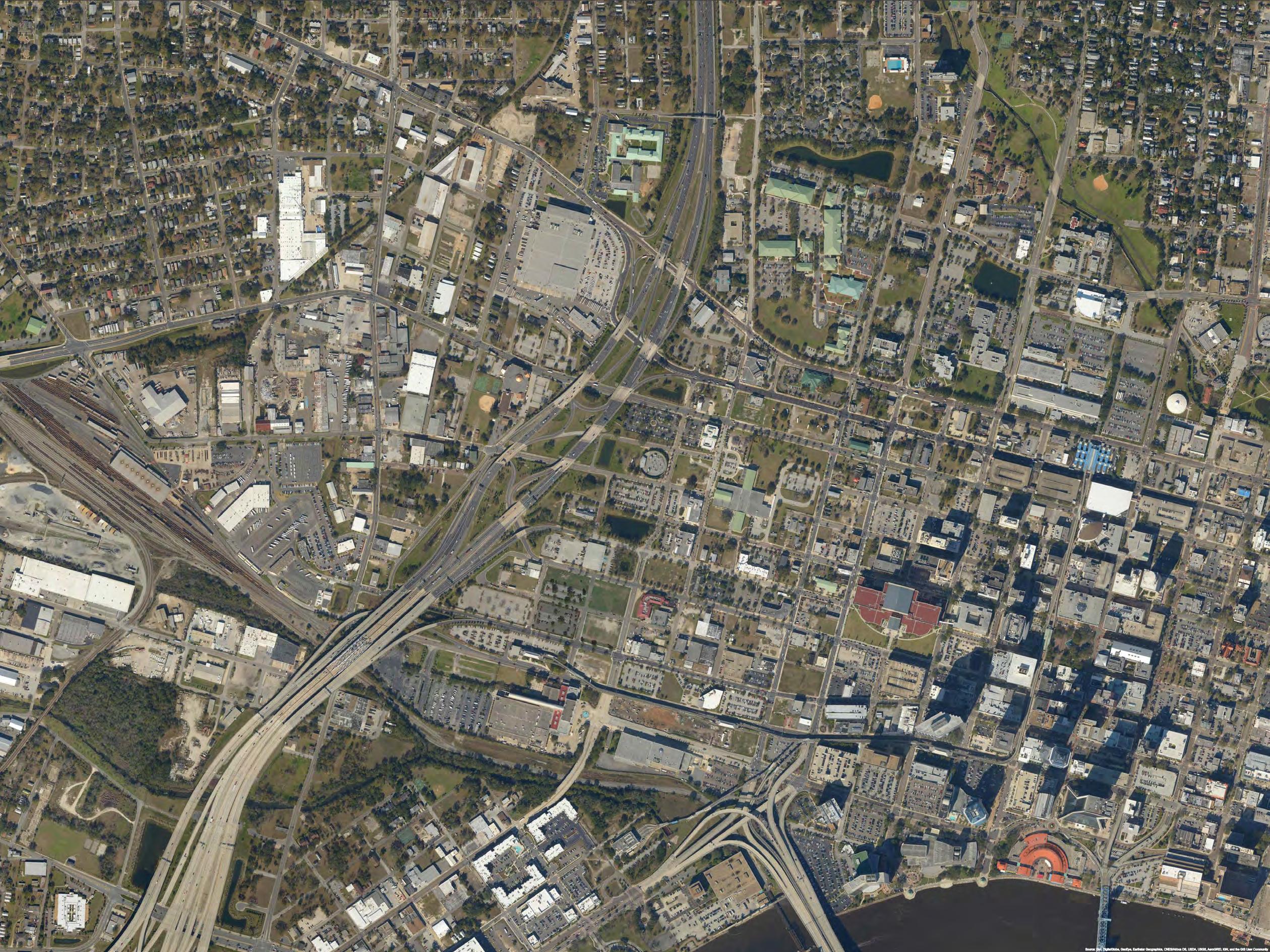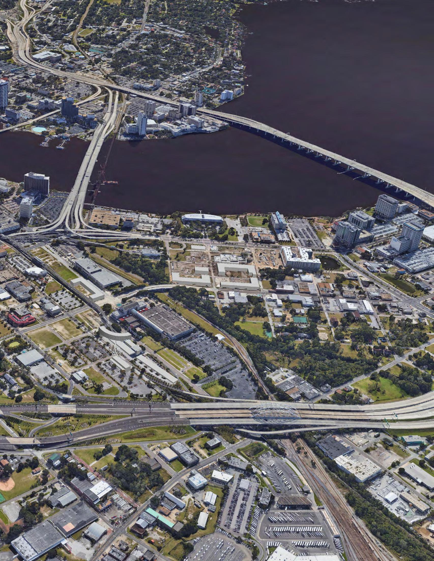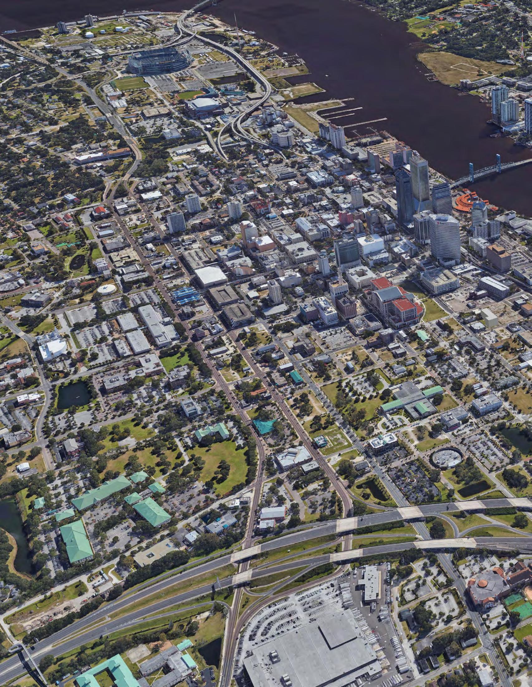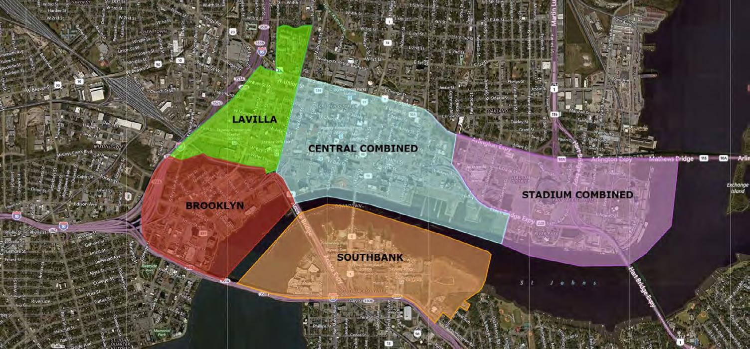 The portion of Downtown Jacksonville which is the focus of this analysis encompasses roughly 3 35 square miles or about 2,144 acres In an effort to inventory and document activity within this area, the area has been divided into smaller areas that closely match the boundaries of the neighborhoods within Downtown Jacksonville, and some neighborhoods were combined with others to more accurately reflect how neighborhoods function together LaVilla, Brooklyn, and Southbank neighborhoods maintained their individual neighborhood boundaries However the other neighborhoods within this downtown area were combined into two distinct areas; the Stadium Combined area encompasses the Stadium and River Park neighborhoods, and the Central Combined area encompasses the Riverfront, Central Civic Core, Cathedral, Institutional, and Church neighborhoods