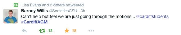 e time of Cardiff Students’ Union Annual General Meeting (a sort of student congress, where anybody can represent themselves and their viewpoints) is good time to meditate on thoughts and feelings like this. I spoke to Daniel Palmer, the chief exec of the Students’ Union, prior to the AGM; he’s worked in other SUs, and he told me that events like the AGM at Cardiff are becoming increasingly rare. I think that’s a shame, because the AGM is arguably student politics at its best.