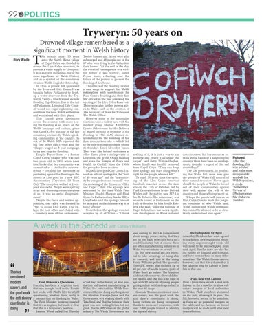 nothing of it, it is just a way to say goodbye and sweep it all under the carpet” said Betty Watkin-Hughes, whose family was forcibly removed from Capel Celyn. “They can keep their apology and start doing what’s right for the people who are left.” To mark 50 years since the opening of the Llyn Celyn reservoir hundreds marched across the dam site on the 17th of October, led by Plaid Cymru’s former leader Dafydd Wigley and the parties new MP Liz Saville Roberts. The anniversary was recently raised in Parliament on the 14th of October by Mrs Saville Roberts who said: “Since the flooding of Capel Celyn, there has been a significant development in Wales’ national