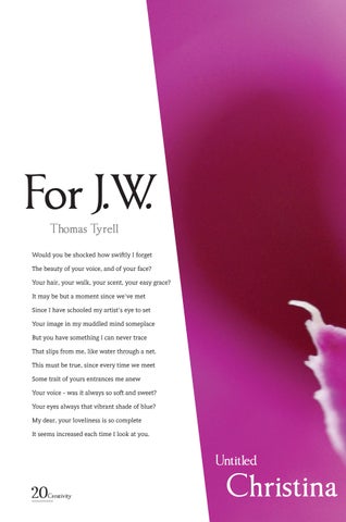 For J.W. Thomas Tyrell Would you be shocked how swiftly I forget The beauty of your voice, and of your face? Your hair, your walk, your scent, your easy grace? It may be but a moment since we've met Since I have schooled my artist's eye to set Your image in my muddled mind someplace But you have something I can never trace That slips from me, like water through a net. This must be true, since every time we meet Some trait of yours entrances me anew Your voice - was it always so soft and sweet? Your eyes always that vibrant shade of blue? My dear, your loveliness is so complete It seems increased each time I look at you.