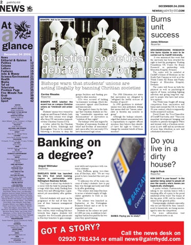 December 04 2006 News 1 Editorial & Opinion 8 Politics 12 Column 13 Letters 14 Features 15 Jobs & Money 19 Science/Environment 21 Health 23 Media 24 Taf od 25 Television 27 Problem Page 35 Five Minute Fun 37 Grab 39 Listings 40 Sport 42 EDITOR Perri Lewis DEPUTY EDITOR Sophie Robehmed ASSISTANT TO THE EDITOR Elaine Morgan CREATIVE EDITOR Graeme Porteous NEWS Adam Millward, Helen Thompson, Jo Dingle, Katie Kennedy POLITICS Andy Rennison EDITORIAL AND OPINION Ed Vanstone, Georgie SPORT Dave Menon, George Pawley LISTINGS Jenna Harris, Rosaria Sgueglia TELEVISION TV Gareth, TV John, TV Neil, TV Jane, TV Ellen LETTERS Rachel Clare GRAB Kayleigh Excell, Lisa Hocken TAF-OD Huw Pritchard SCIENCE & ENVIRONMENT Ceri Morgan MEDIA Aline Ungewiss, Nadia Bonjour HEALTH Liz Stauber JOBS AND MONEY Gill Roberts PROBLEM PAGE Grace De Ville FIVE MINUTE FUN Lara Bell PICTURE EDITORS James Perou, Sarah Day SUB EDITOR Cathal McMahon ONLINE EDITOR Paul Springett CONTRIBUTORS Corrine Rhoades, James Stileman, Abigail Whittaker, Angela Pook, Tim Mohan, Tasha Prest-Smith, Emma Jones, Lee Macaulay, Matthew Horwood, Natalie Perkinson, Alicia Whitthread, Samantha Shillabeer, Catherine Gee, William Taylor, Victoria Lane, Huw Davies, Hannah Windsor, Tim hewish, Lucie Apampa, Hollie Clemence, Andrew Styles, Dan Ridler, Chris White, Anna Milewski, Kirsty Page, Georgina Wilmott, Lucy Higgins, Marianne Fisher, Laura Foster, Pierre Mason, William Taylor, Sian Miguel, James Smith, Alex McIntosh, Tom Williams, Ed Pitchforth, James Woodroof, Becky Oatley, Jack Zorab, Erica Ballantyne, Jo Price, Scott D’Arcy, Emma Green, Chris Croissant, Hayley Poter, Angharad Jones, Settor Tengey, Adam Gasson PROOFREADERS Kieran Harwood, Rachel Greenwood, Aisling Tempany ADDRESS University Union, Park Place Cardiff, CF10 3QN ADVERTISING 02920 781 474 EMAIL gairrhydd@gairrhydd.com WEB www.gairrhydd.com LOCATION 4th Floor Students’ Union