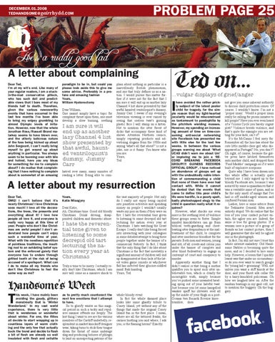 A letter about complaining Dear Ted, I'm at my wit's end. Like many of your regular readers, I am a stuckin-the-mud conservative pillock, who has such dull and predictable views that I bore most of my friends half to death. Therefore, given the various newsworthy events that have occurred in the last few months I've been able to bring my snipey grumbling to almost Olympic levels of irritation. However, now that the whole Jonathan Ross/Russell Brand malarkey seems to have blown over, and the utterly ludicrous nature of the fuss being kicked up about John Sergeant, I can't really bring myself to get wound up about anything in particular. You always seem to be teeming over with bile and hatred, have you any ideas for something for me to complain about? I do realise that complaining that I have nothing to complain about is somewhat of an amusing
