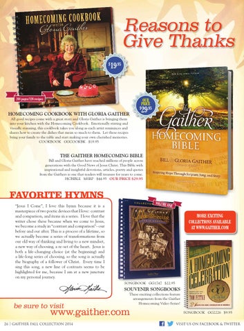 HOMECOMING COOKBOOK WITH GLORIA GAITHER All good recipes come with a great story and Gloria Gaither is bringing them into your kitchen with the Homecoming Cookbook. Emotionally stirring and visually stunning, this cookbook takes you along as each artist reminisces and shares how to create the dishes that mean so much to them. Let these recipes bring your family to the table and start making your own cherished memories. COOKBOOK GGCOOKBK $19.95