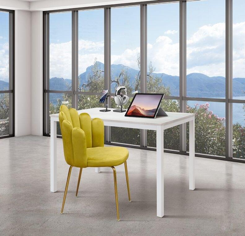 base in metallo colore bianco piano nobilitato finitura bianco frassinato con 2 allunghe interne da 40 cm.