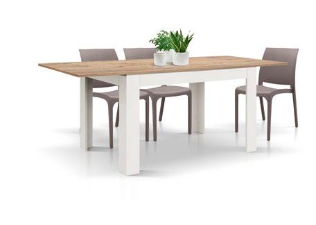 tavolo struttura laccato bianco piano in nobilitato finitura rovere rustico con 1 allunga da cm. 50. table white lacquered structure melamine top rustic oak wood finish with 1 extension of cm. 50. cm. l 120/170 p. 90 h. 77