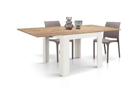 tavolo struttura laccato bianco piano in nobilitato finitura rovere rustico. table white lacquered structure top in melamine rustic oak wood finish. cm. l 90/180 p. 90 h. 79/77