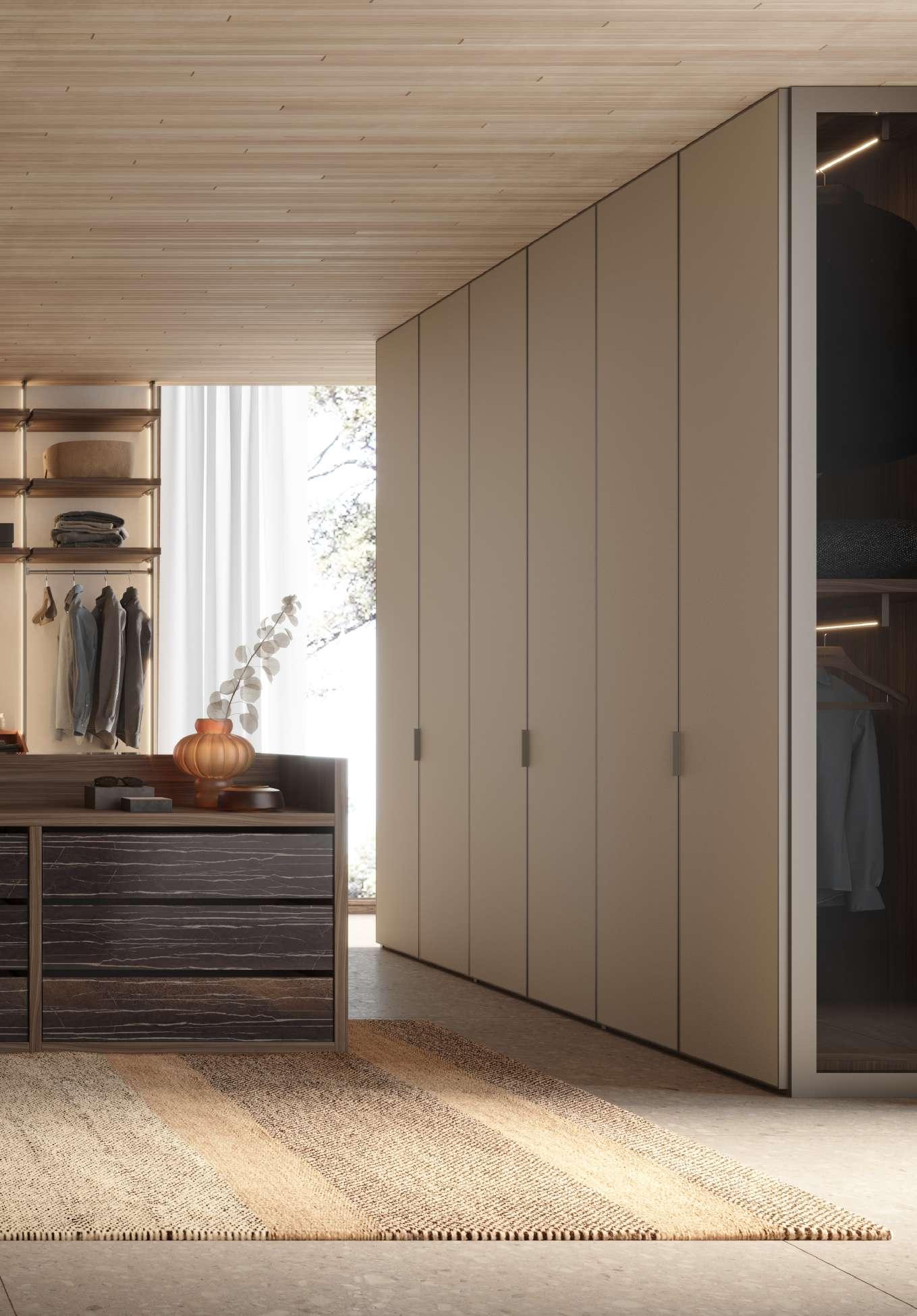 La luminosità e l'aspetto materico del Calce creano un felice contrasto con l'austerità del Noce Ossidato. Al progetto sono stati integrati, sul lato sinistro, un armadio a ponte della Collezione Night e, nel centro stanza, un divano Infinity della collezione Living.