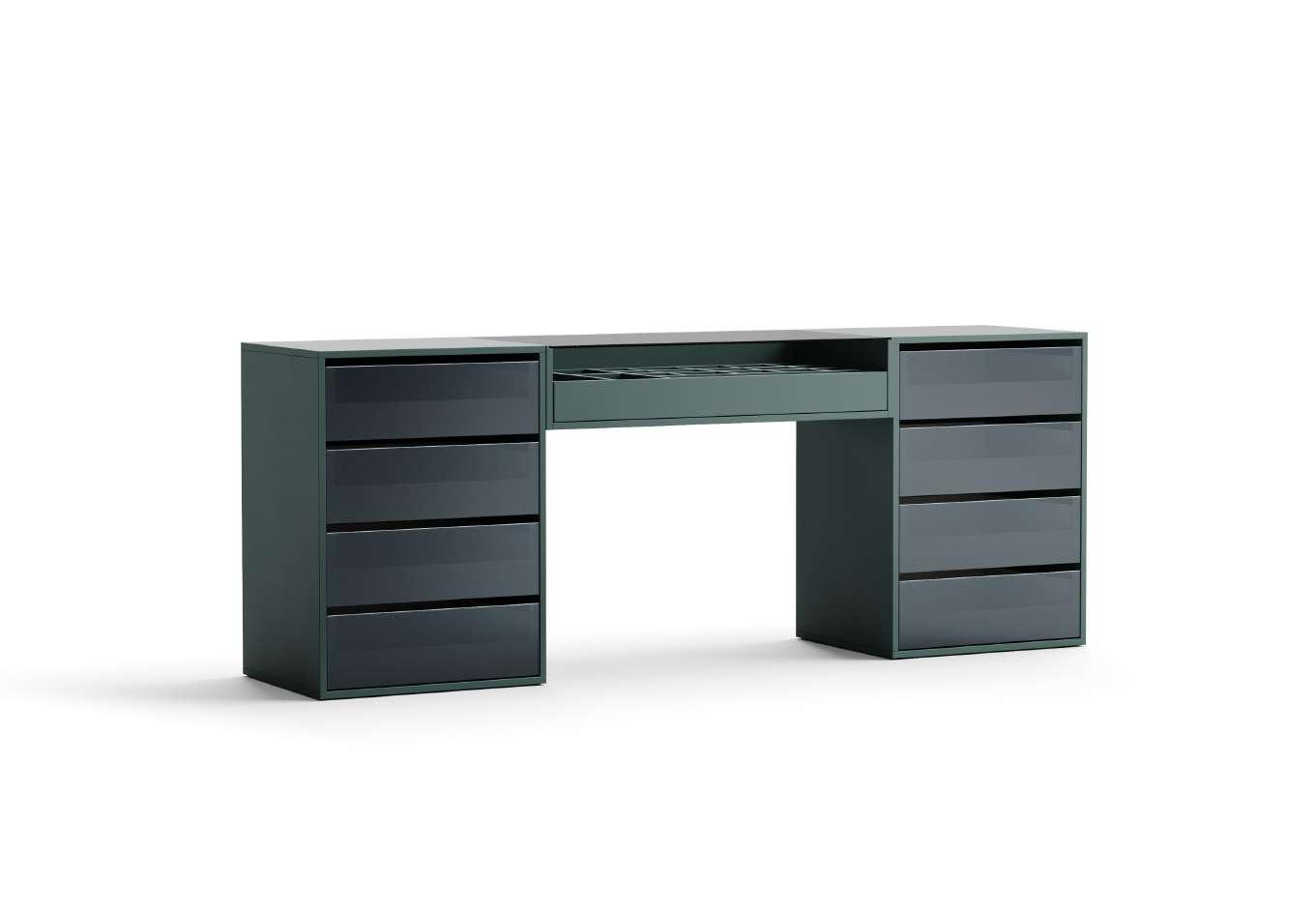 Il Grafite degli accessori in metallo, invece, come una matita definisce linee e spazi, rafforzando i contrasti e conferendo un aspetto vagamente industrial. Protagonista al centro stanza una grande consolle con porta accessori estraibili, frontali cassetto in vetro scuro e poltroncina imbottita terminale munita di comodo cassettone.