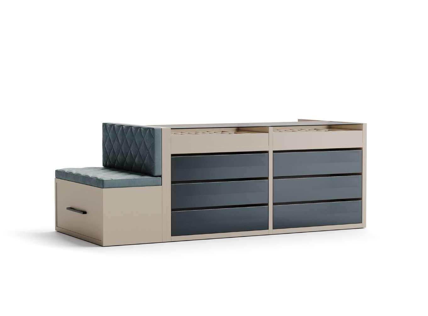Protagonista è la zona trucco centrale che, con cassetti effetto cannetè ed alzatina con specchio, ha le sembianze di un vero e proprio camerino da teatro, quel luogo di confine che assiste alla metamorfosi del trucco e della vestizione, accoglie confidenze, battute, ansia e liberazione. Il colore laccato Fenix Seta dona all'ambiente luminosità ed un fascino fresco e puro, quasi di eterna giovinezza. A fare da contorno due comò Bridge, un letto Nubes ed un comodino Riva della Collezione Night.