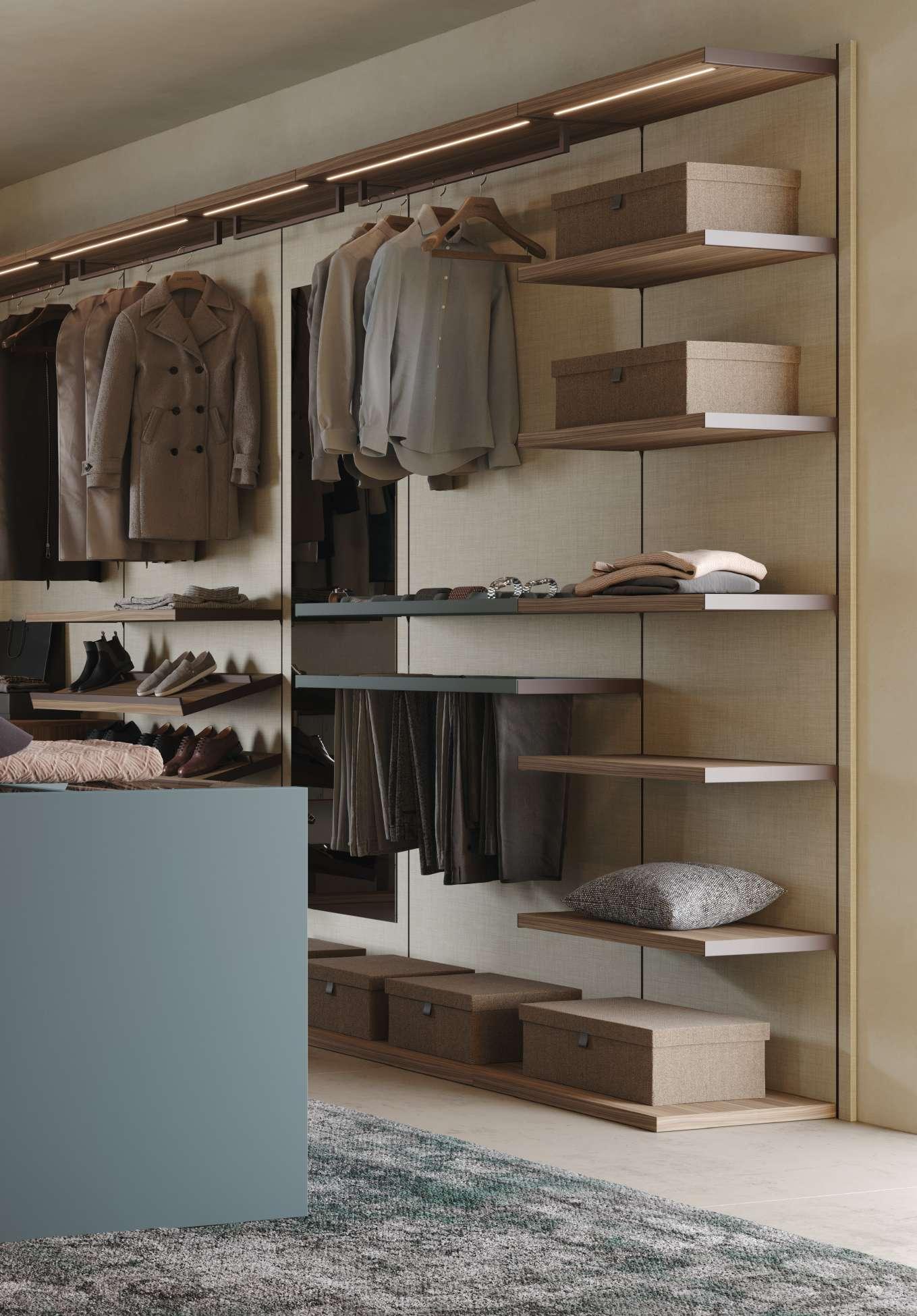 Atena, cabina boiserie qui proposta in combinazione con l'armadio Open della Collezione Night nella versione in nobilitato Noce Java e telaio in alluminio verniciato Brown. La finitura Lino delle boiserie e l'illuminazione a Led integrata nei ripiani in alto alleggeriscono le note calde e legnose del Noce Java.