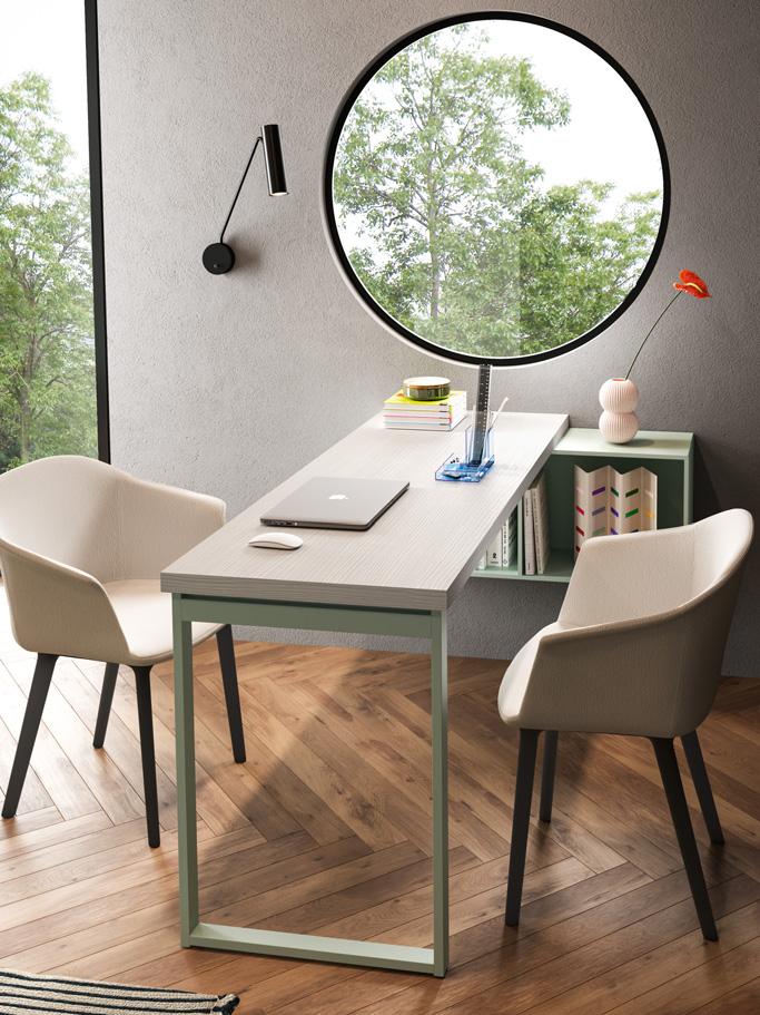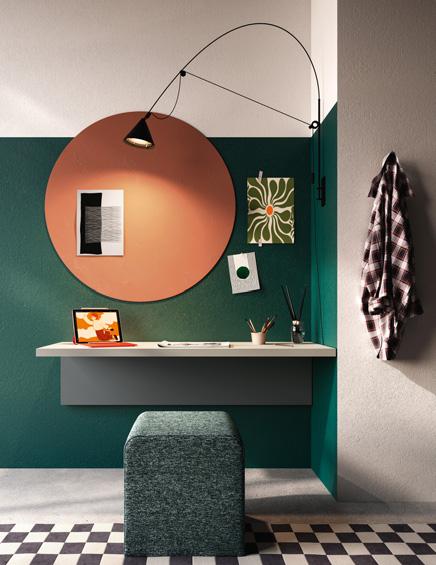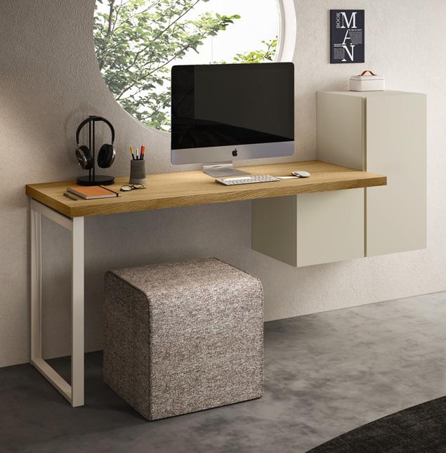 STUDY AREA - Structured study area with shaped floating desk top flanking the wardrobe module. To the right of the top, a wallbox composition and a metal L-box.