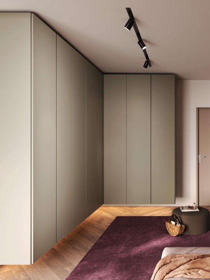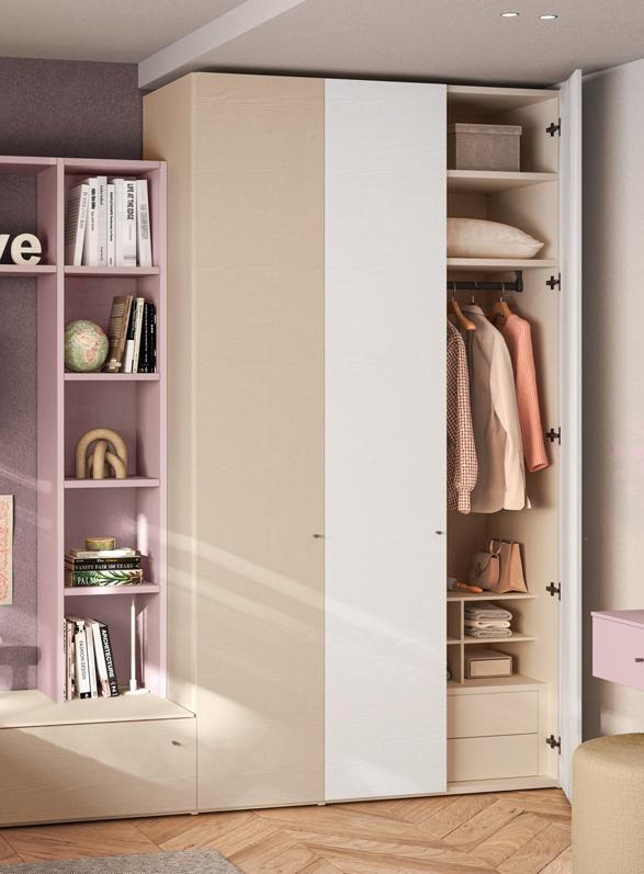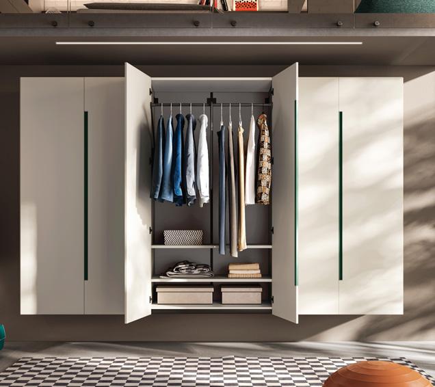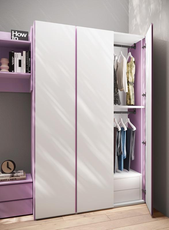 WARDROBE - A full-wall wardrobe is not always the best choice. In a small room, the three-door hinged wardrobe, 226 cm high, furnishes without being too bulky. It is equipped inside with hanging rails, a drawer unit, and an LED strip light inserted into the lacquered side.