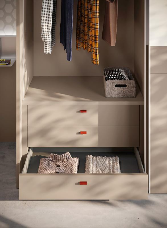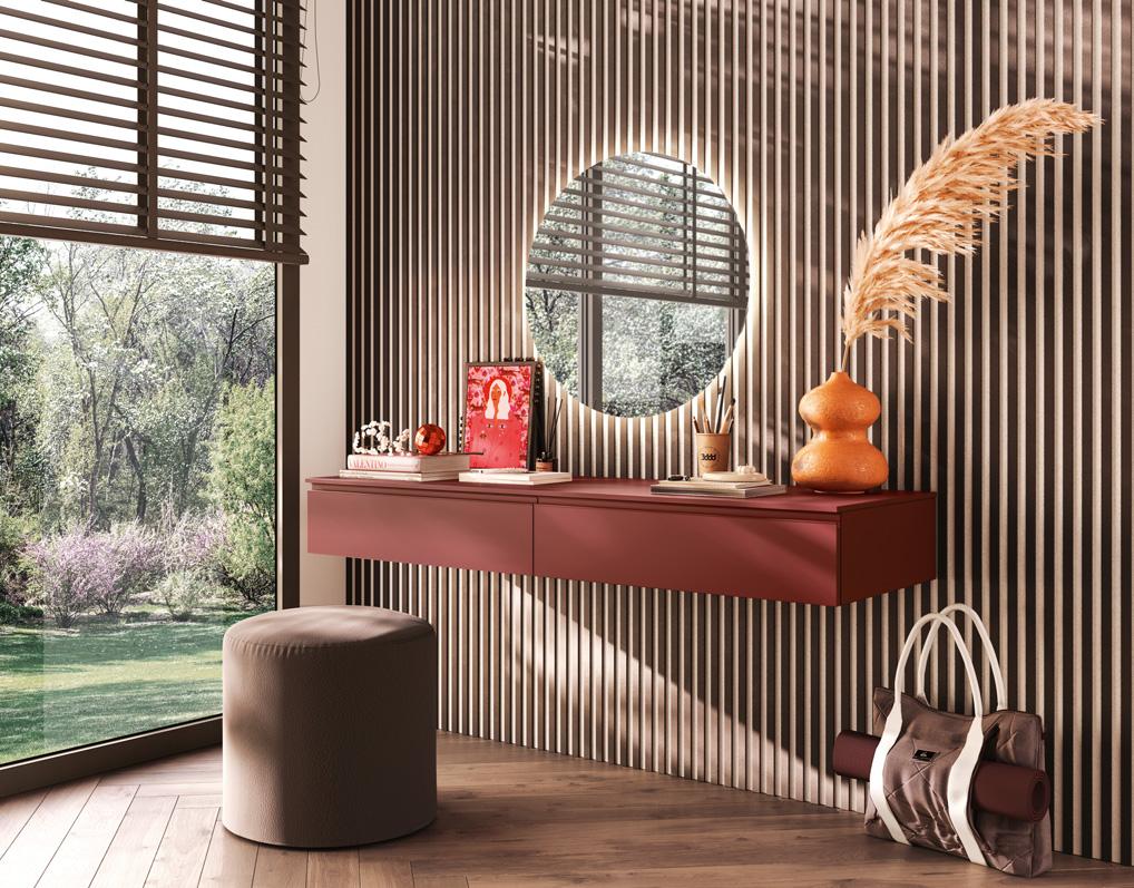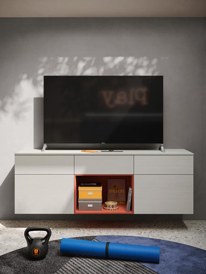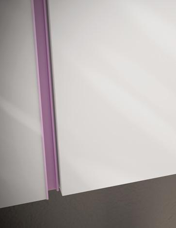 The floating wallbox modules have doors in light white melamine, without visible handles, which open thanks to the contrasting dahlia-coloured lacquered groove profile.