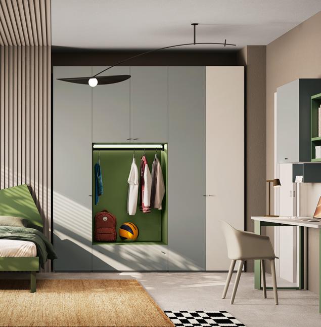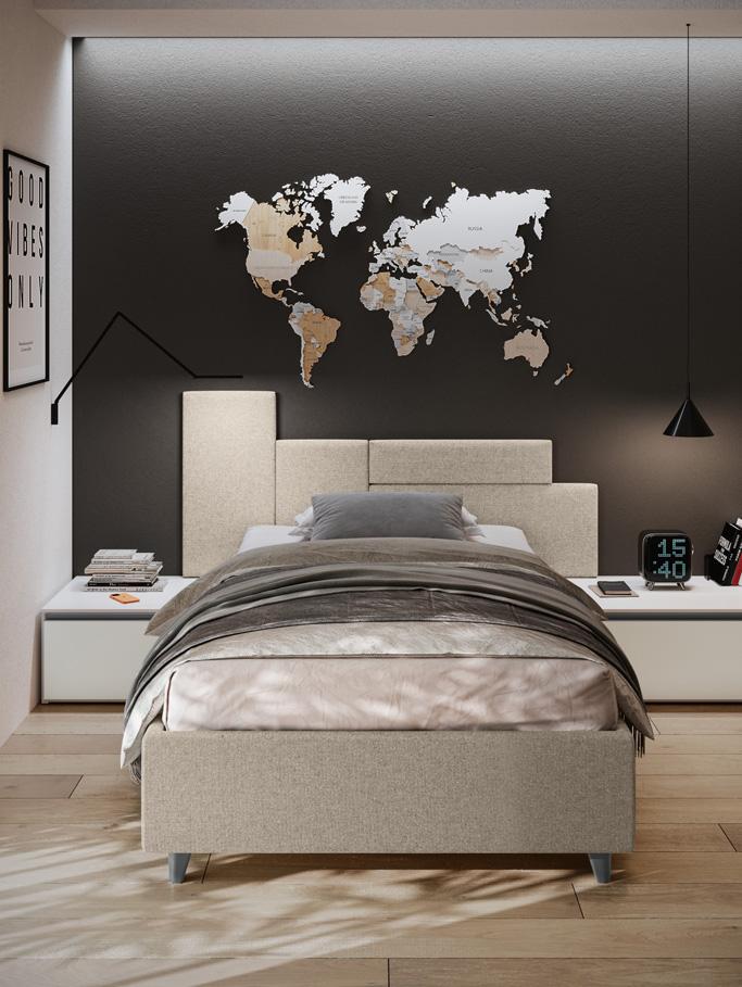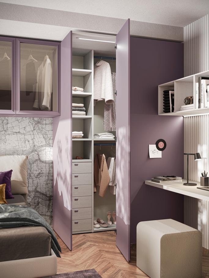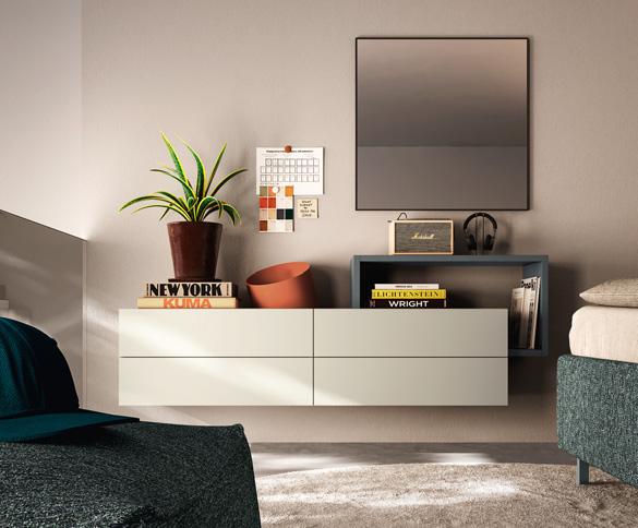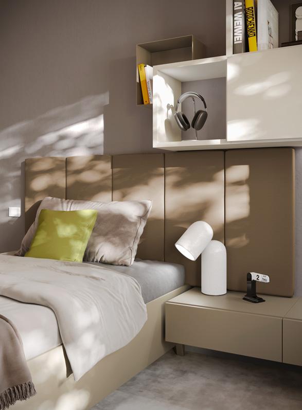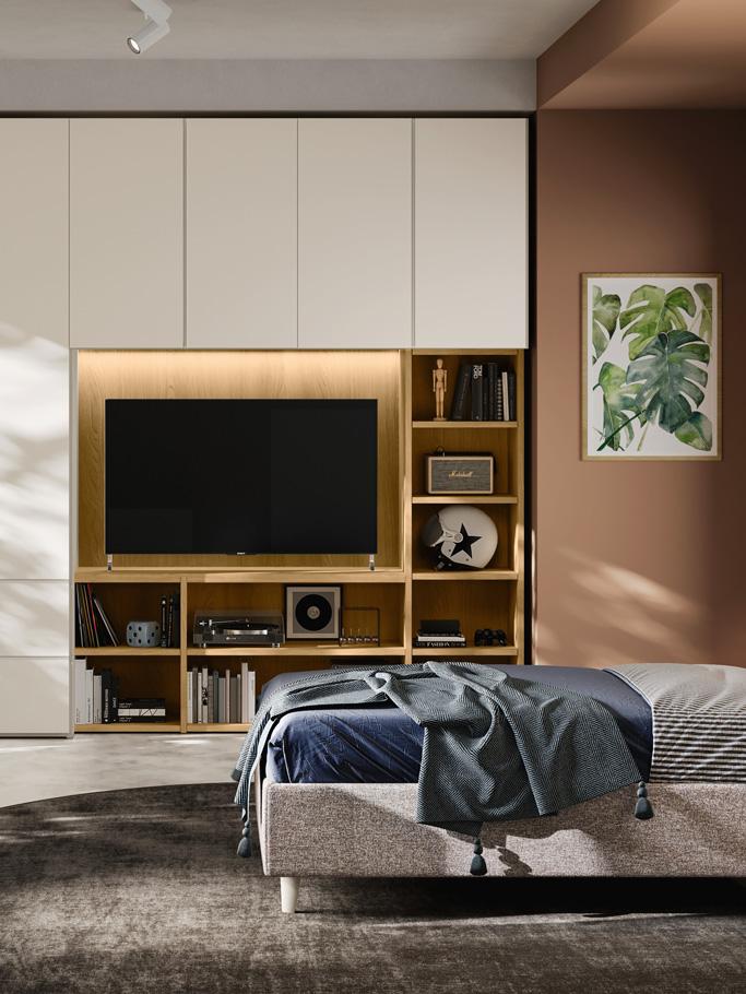 BED - The upholstered sommier bed uses a Wally panel covered in fabric and equipped with LED strip lighting as its headboard. Open, door and drawer wallboxes, which also differ in their choice of finishes, complete the sleeping area.