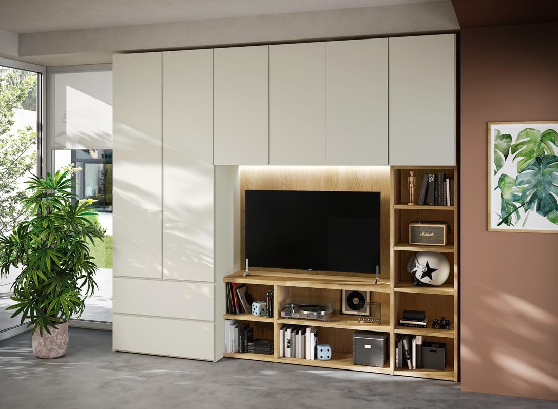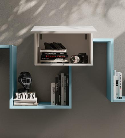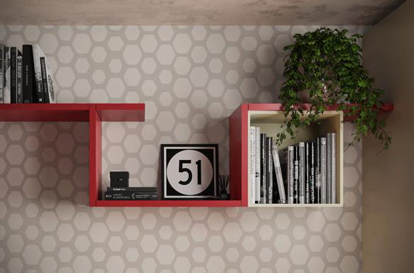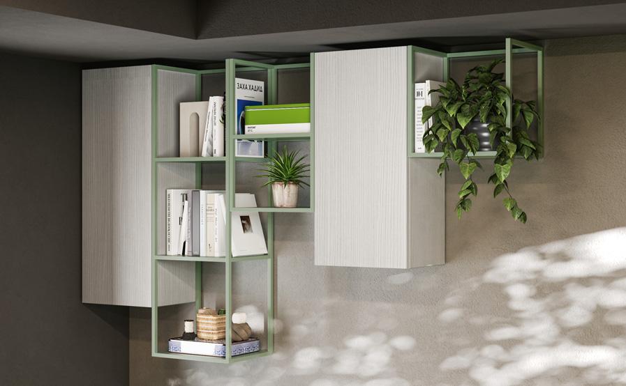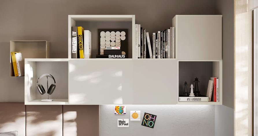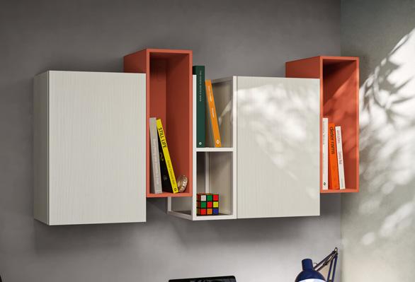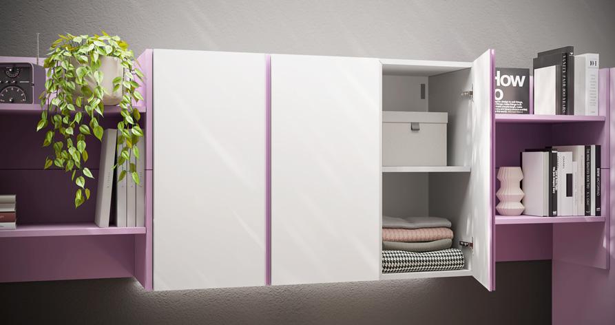 moduli wallbox sospesi hanno ante in nobilitato bianco luce, prive di maniglie a vista, che si aprono grazie al profilo gola laccato a contrasto colore dalia.