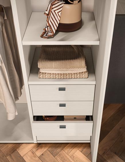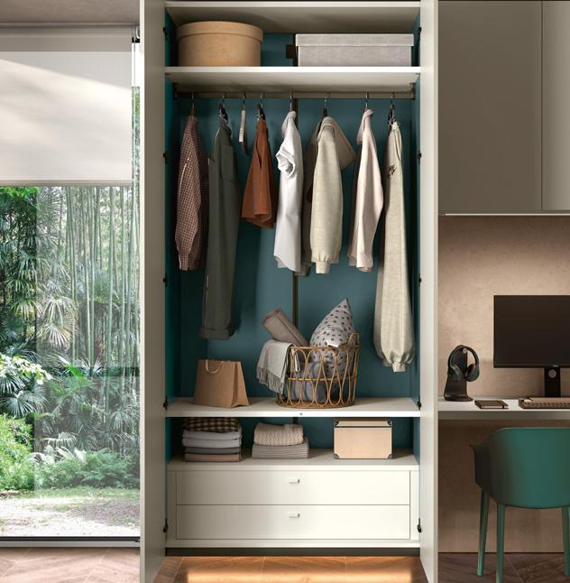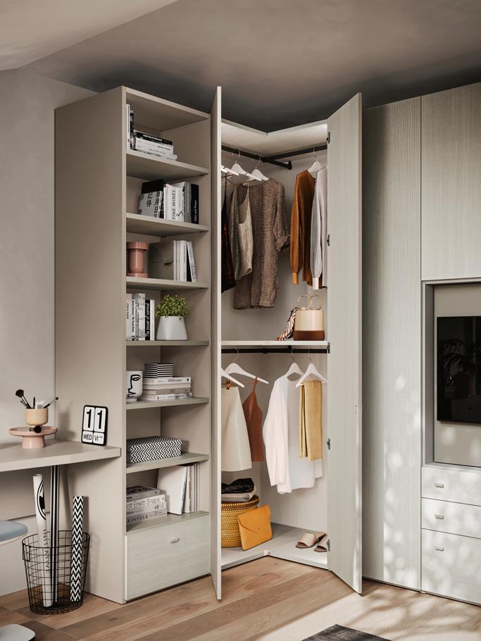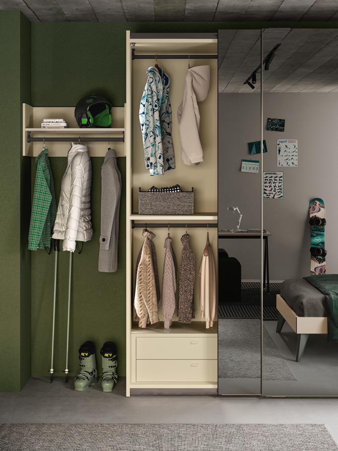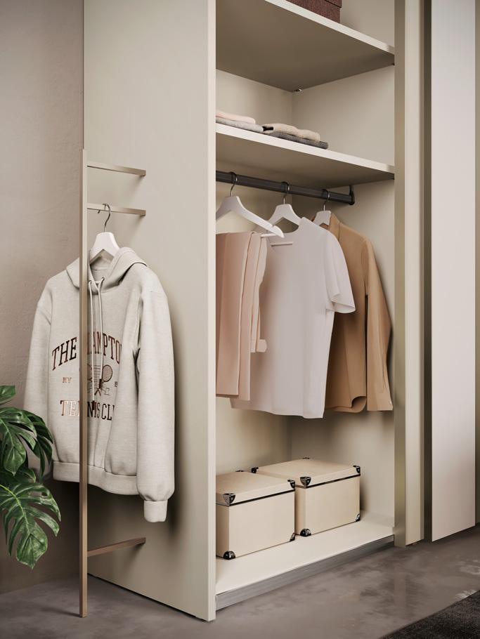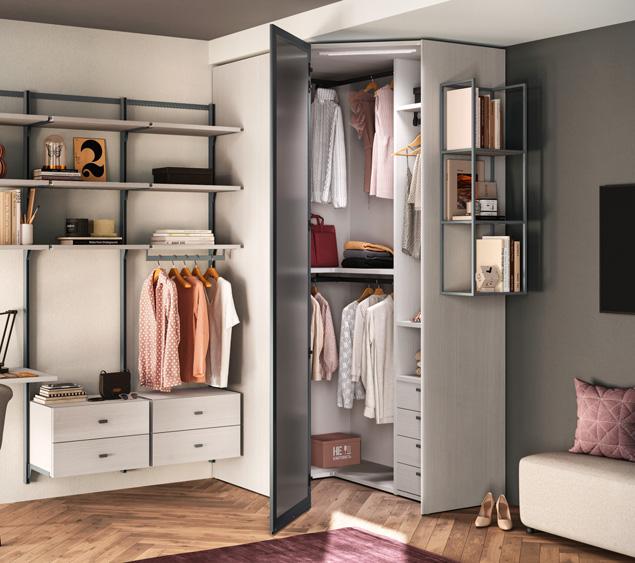 The end units are designed to enrich and complete the modularity of the wardrobes: from the simplest model, Open, with a straight or diagonal cut back, to the Jolly and Liberty end units, which offer combined closed and open spaces with shelves, rails, hanging hooks and mirrors.