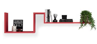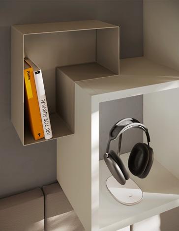 BOOKCASE - Outline offers great compositional flexibility with different sized sides and shelves to achieve the most creative solutions. The side panels and floating partitions are fixed to the wall with concealed pocket attachments with a system to prevent accidental release.