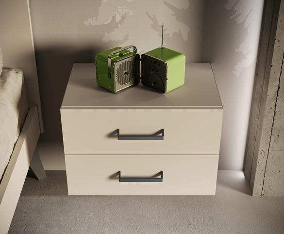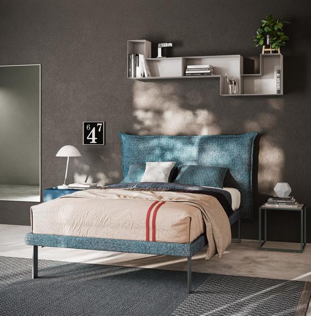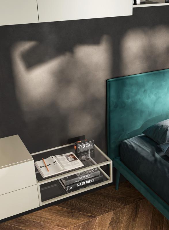 Letto imbottito con testata Step, cui si affianca il comodino composto da due wallbox sovrapposti, uno a giorno e uno con cassetto, ruotabili per assumere posizioni diverse.