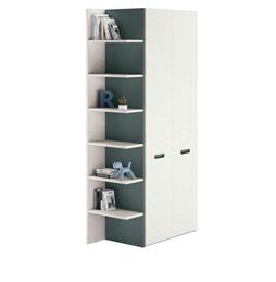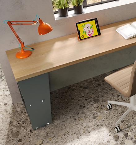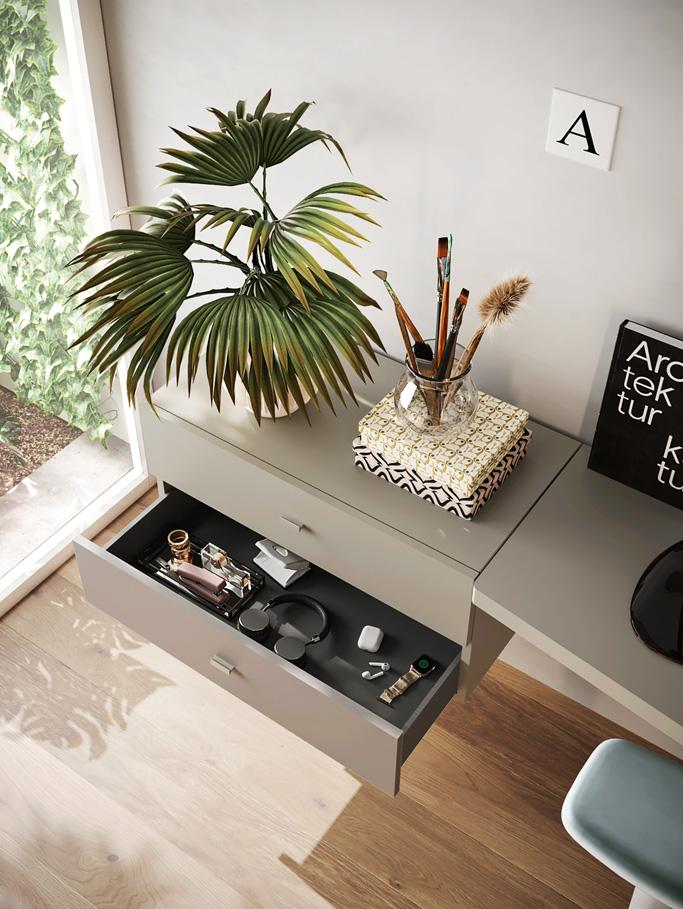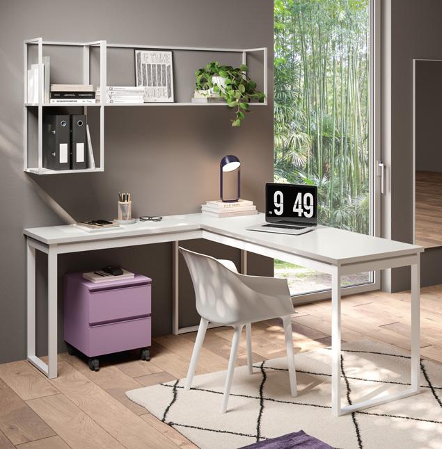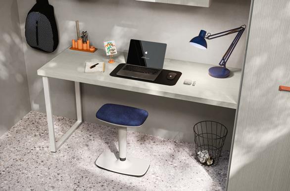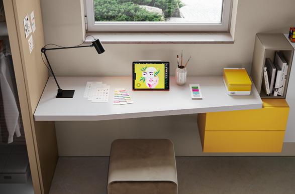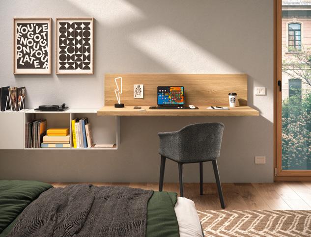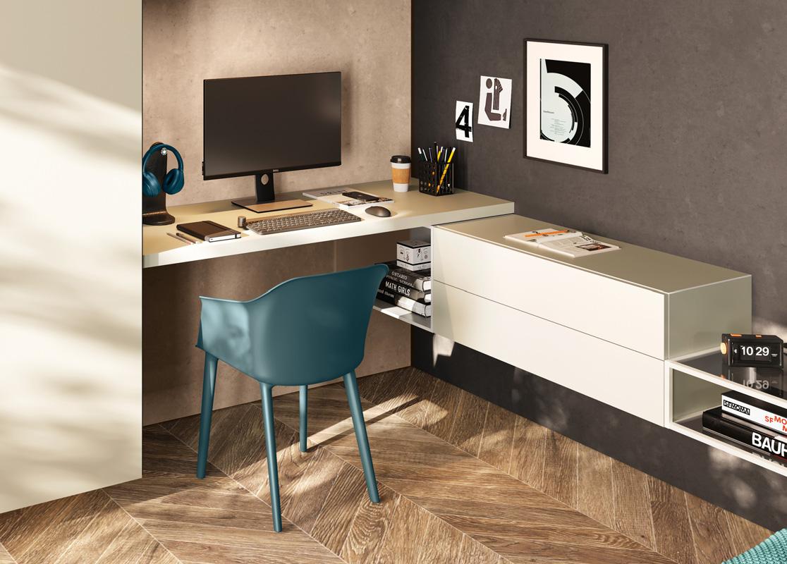 STUDY AREA - Study area furnished with a shaped laminate desk top and a floating wallbox with two drawers. To the right, the wardrobe is completed with a bookcase unit that offers plenty of storage space for books and notebooks.