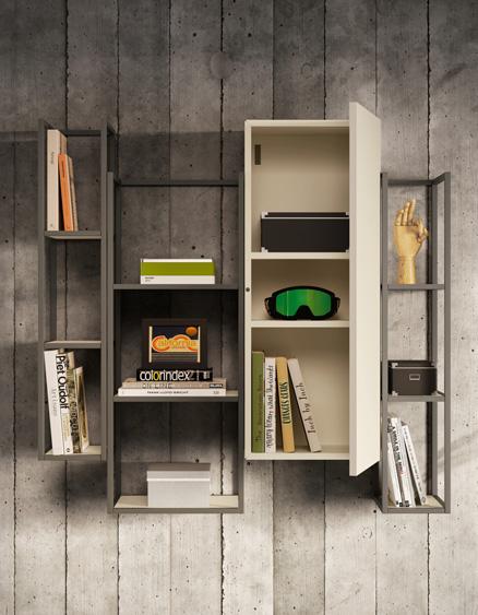 Di grande flessibilità compositiva, Outline ha fianchi e ripiani di misure diverse per dare vita alle soluzioni più creative. I fianchi e i tramezzi sospesi sono fissati a parete con attaccaglie su tasca a scomparsa con sistema di antisganciamento.
