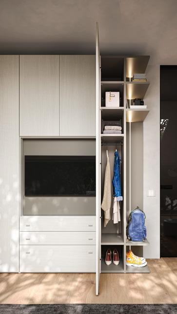 WARDROBE - Hinged door wardrobe with open module and TV panel: the pivoting panel conceals fully usable shelves in depth. Completing the wardrobe is the Liberty end unit with mirror and LED light built into the side that switch on by wireless remote control.