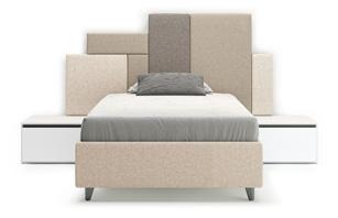 BED - Upholstered bed with Step headboard, complemented by a bedside table consisting of two stacked wallboxes, one open and one with drawer, which can be rotated into different positions.