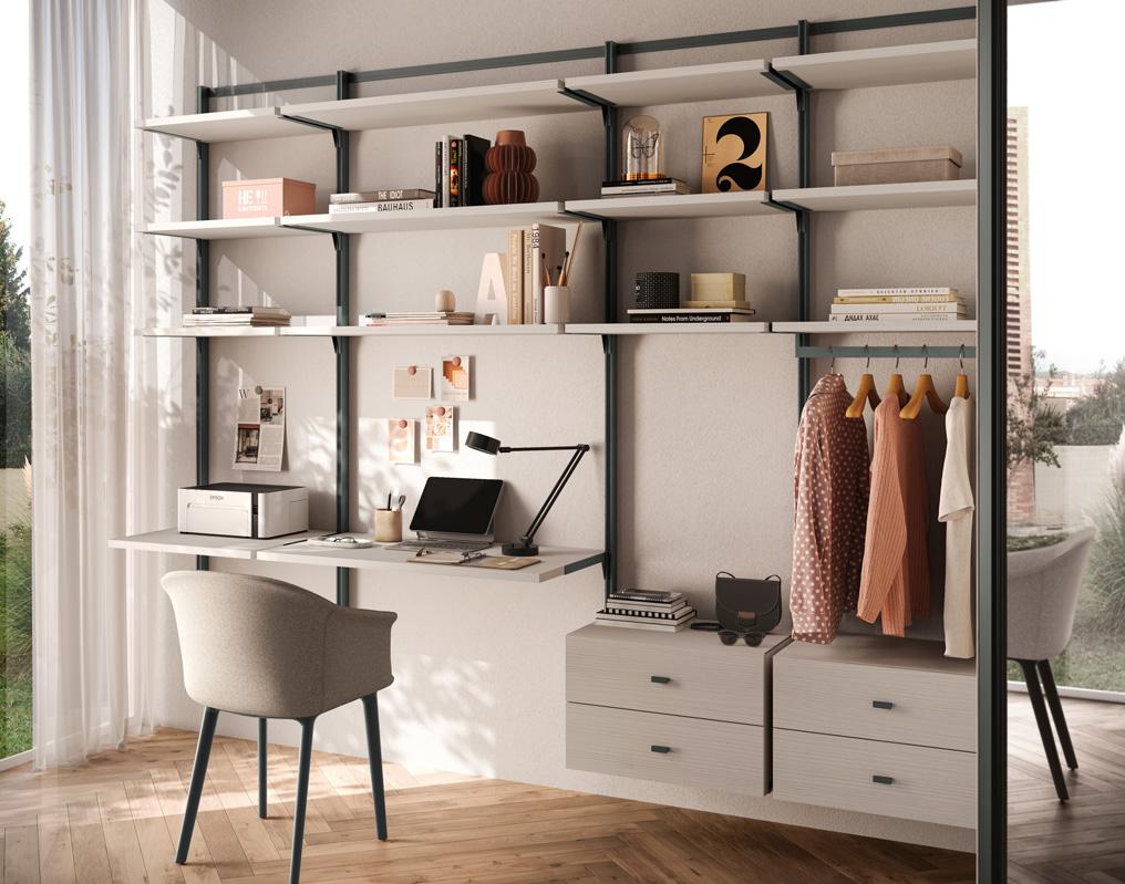 Zona studio strutturata con piano scrivania sagomato e sospeso affiancato al modulo armadio. A destra del piano, una composizione di wallbox e un L-box in metallo.