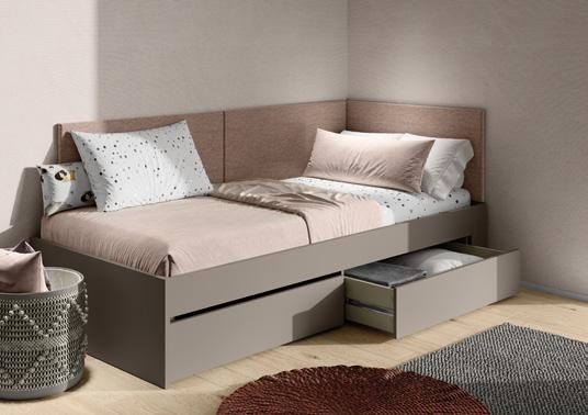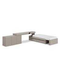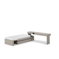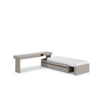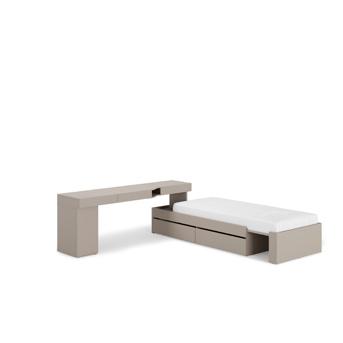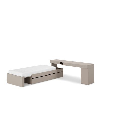 Łóżko zostało zaprojektowane z myślą o maksymalnej oszczędności miejsca – można je rozsunąć w taki sposób, by ustawić na nim biurko.