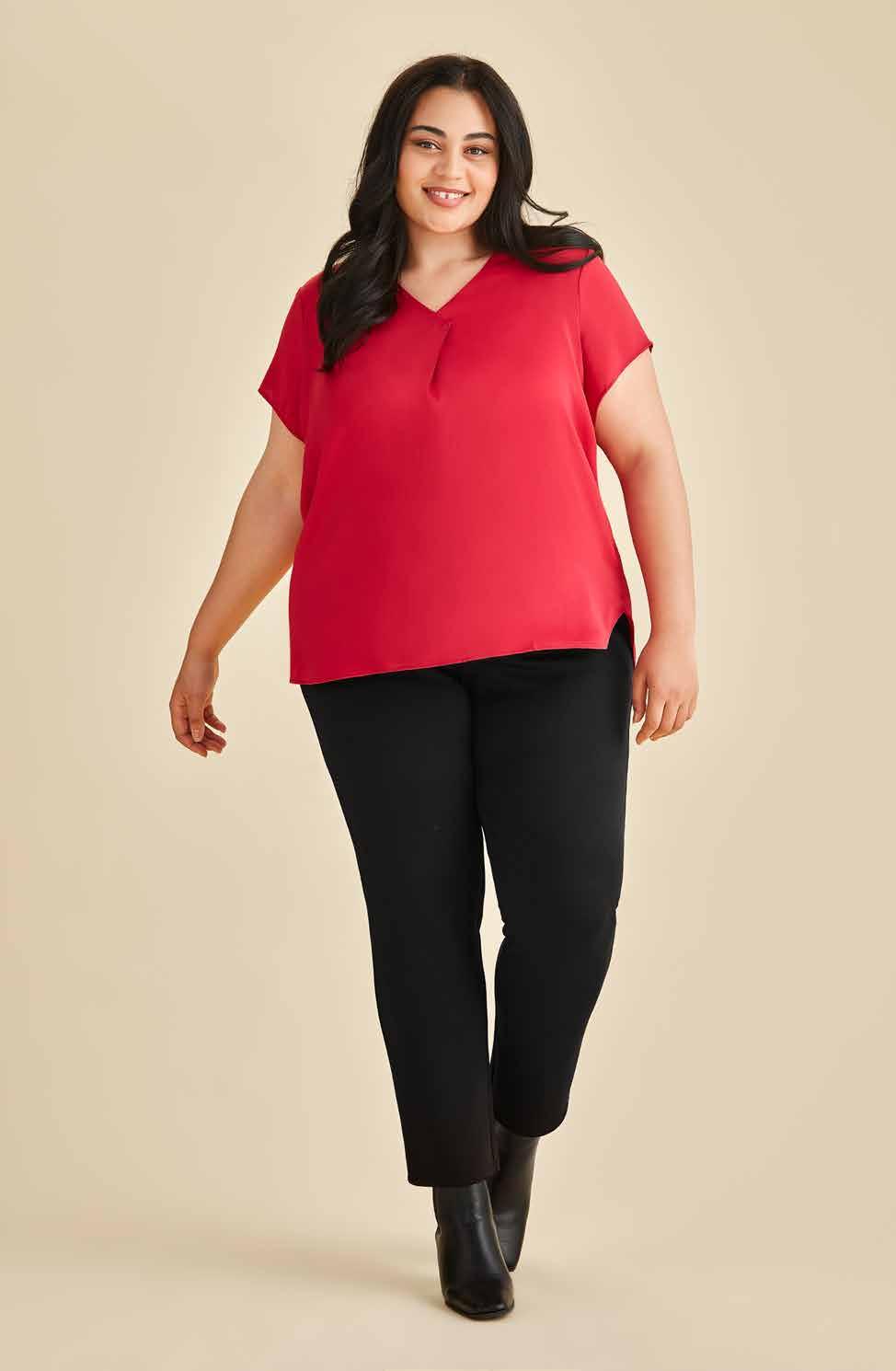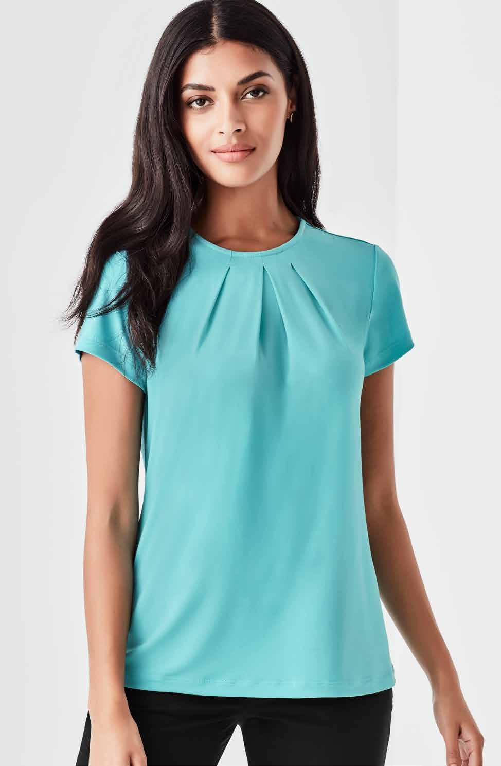 This short-sleeved style has a classic crew neckline with pleat details, it’s designed to be a semi-fitted top. Wear yours tucked in or out.