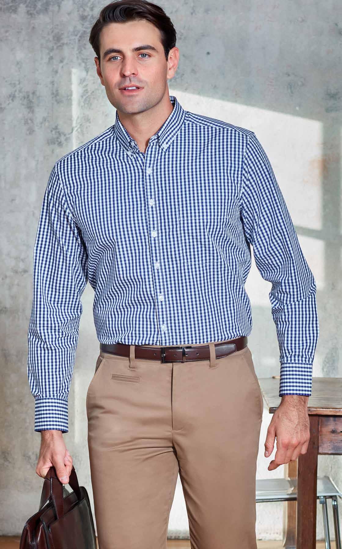 100% Cotton in a yarn-dyed layered check design that sets it apart from the classic plaid.