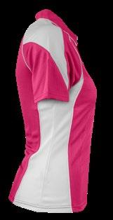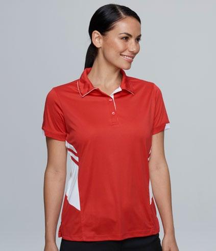 160gm 100% polyester mini-waffle knit, with moisture removal technology, easy care fabric, self fabric V neck collar for ladies and contrast piping on the placket and sleeve. (Loose pocket mens only).