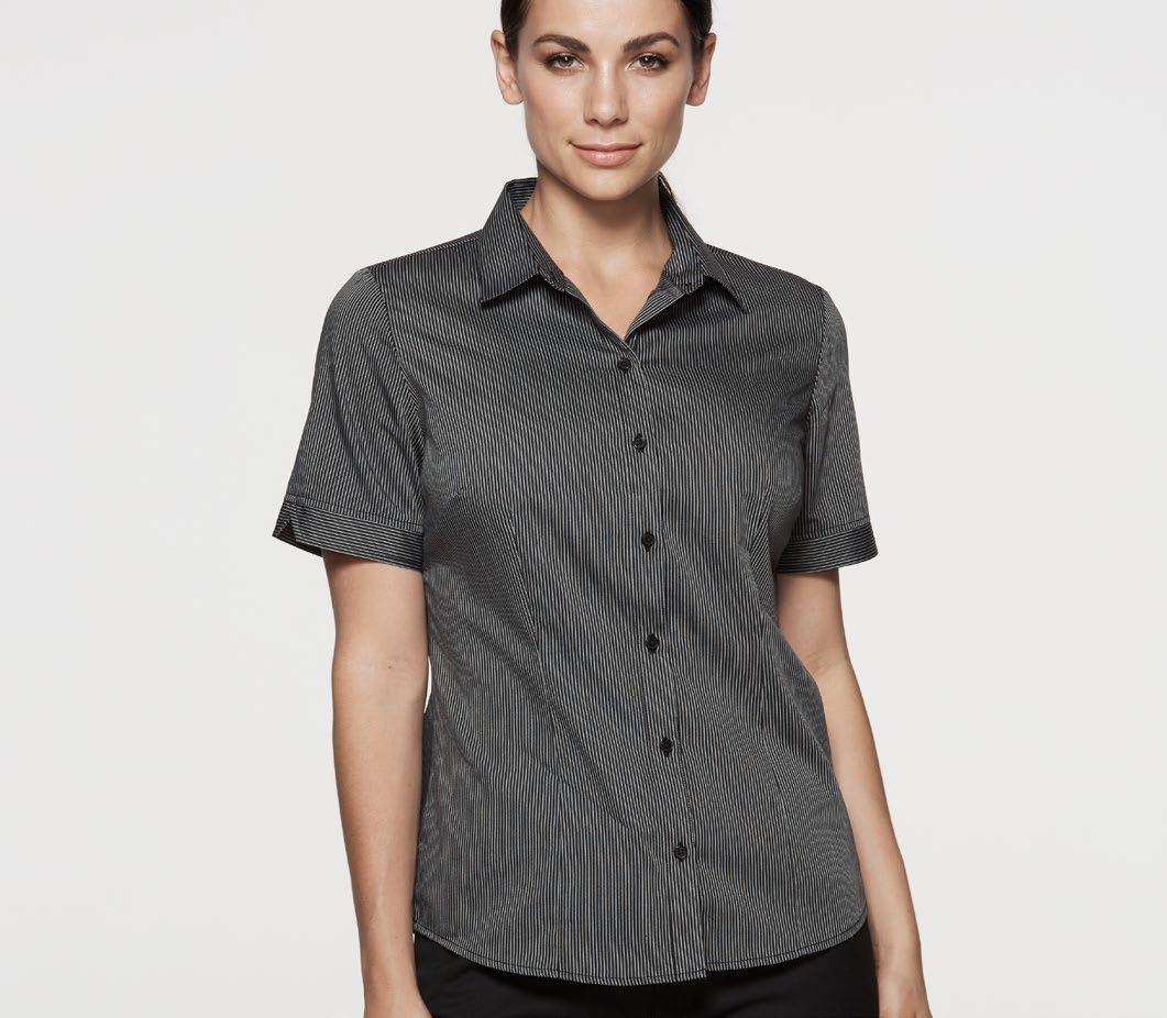 Woven corded twill stripe fabric features an angled arrow head finish at the back of the collar. Two sleeve lengths are available, with a pleated bias cut placket contrasting cuff on the long sleeve. 65% polyester/35% cotton with an anti-pilling treatment.