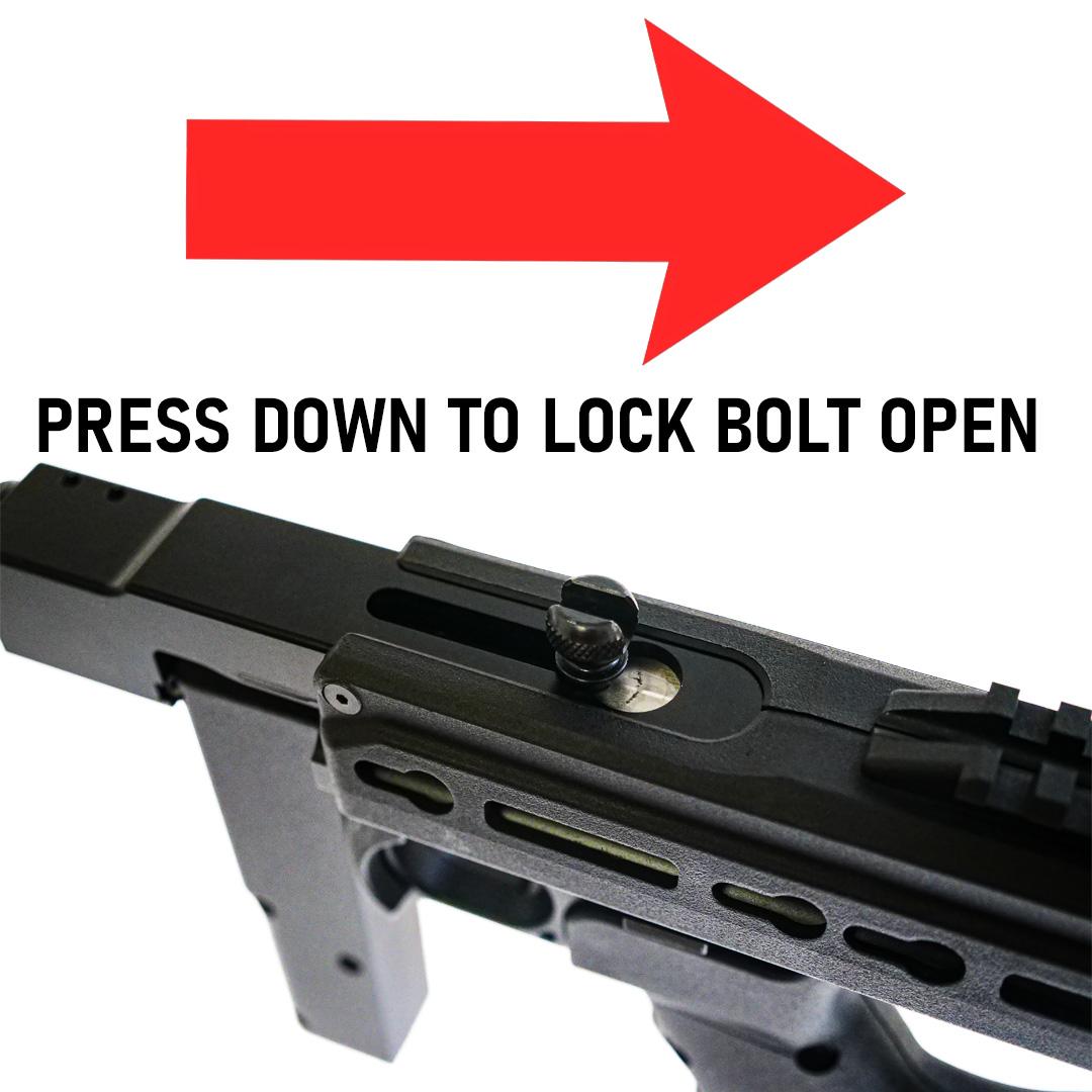 To lock the bolt open: Retract the bolt handle towards its extreme rearward position and, while retracting, press up on the safety button until it slides up to the “lock” position.