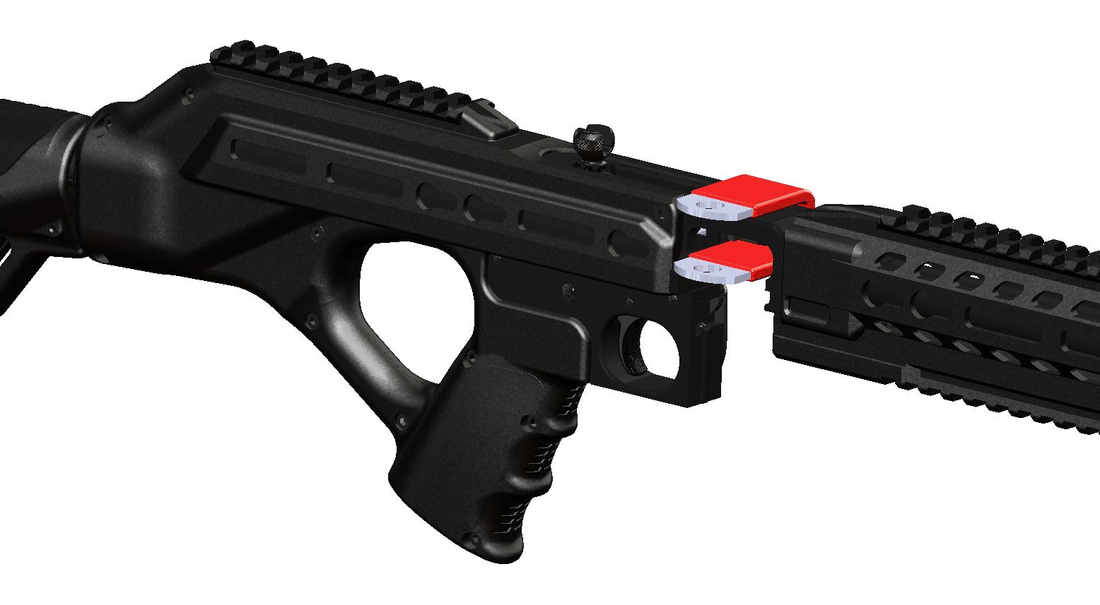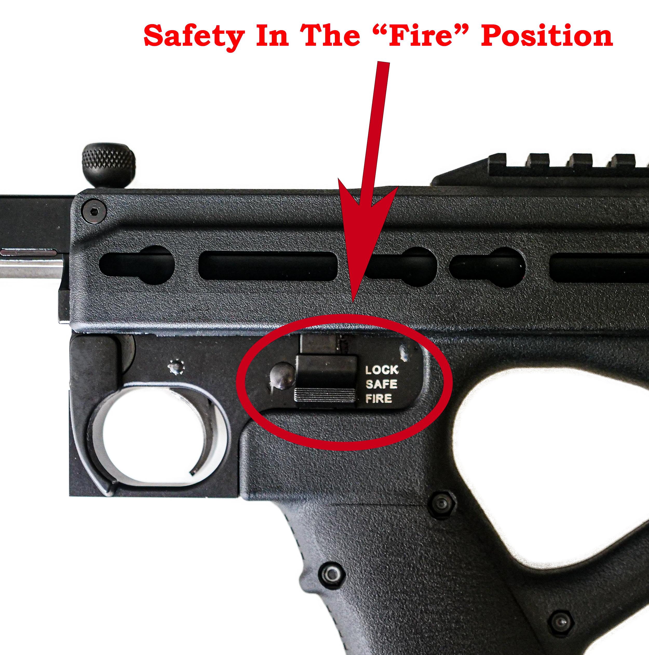 •Grab the bolt handle and pull the bolt toward the rear of the gun. When bolt reaches its rear limit let go and allow the return spring to close the bolt and feed the cartridge. As the bolt is being pulled back, the safety button will be moved down into the ‘SAFE’ position.