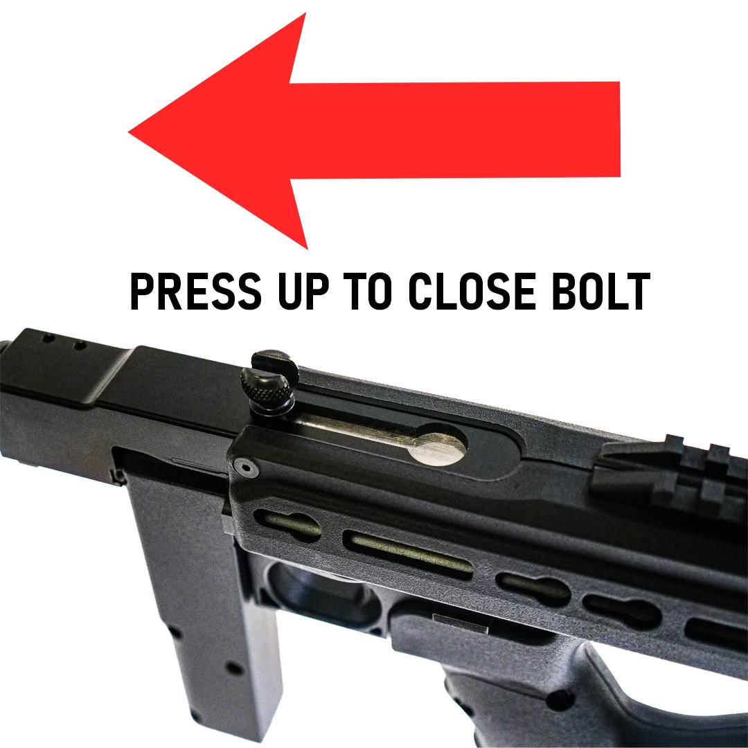 To release the bolt: Retract the bolt handle to its extreme rearward position and then release the bolt and it will move fully forward, or press down on the safety button.