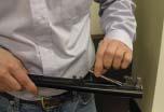 Make sure assisted opening mechanism is fully seated, then slide mechanism until front pin is fully inserted in the hole in the forend loop
