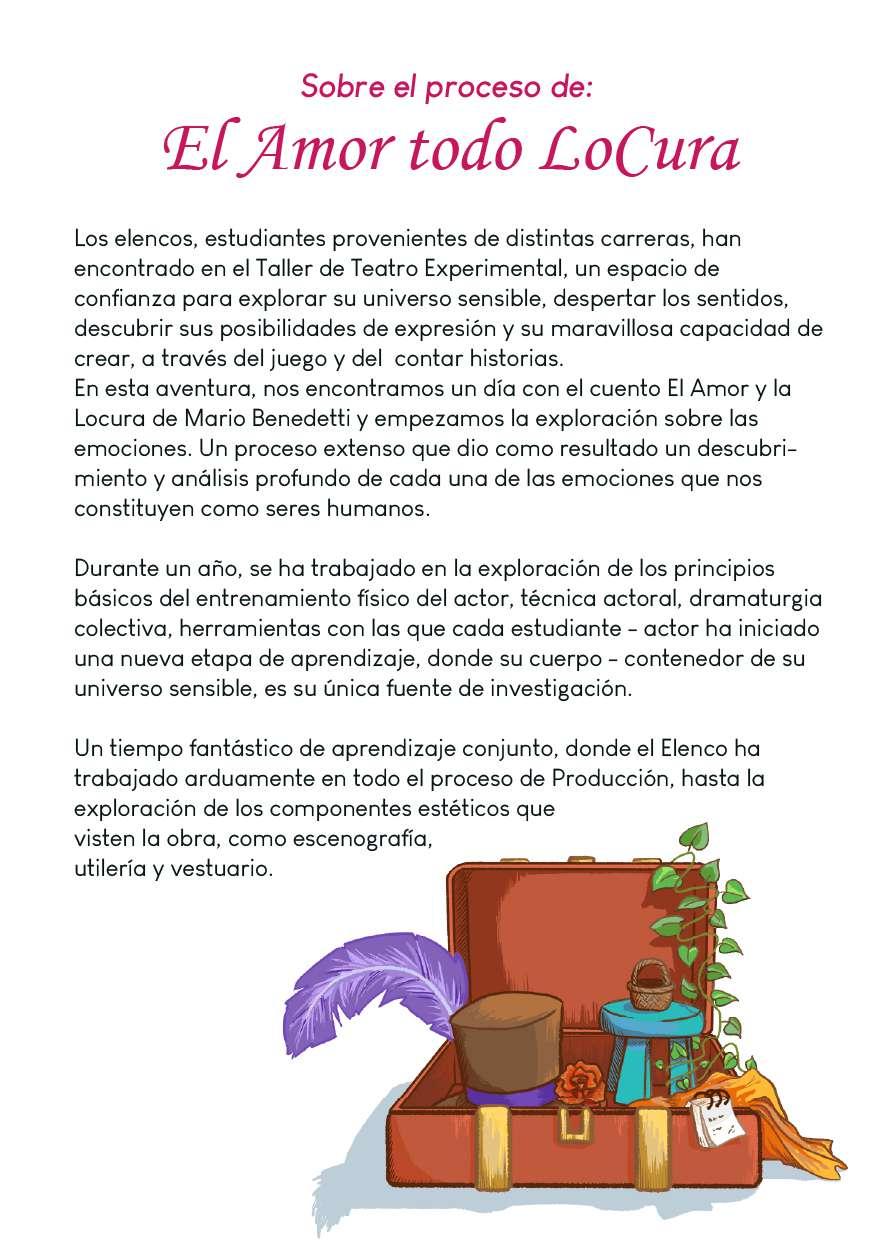 En este programa de mano podrán conocer la sinopsis de la obra, la historia del taller y un poco del proceso de creación, así como todos quienes han hecho posible esta fantasiosa producción. ¡Disfruten!