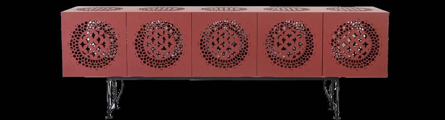 A cabinet that appears lacy, handmade, is actually a sheet of lasercut metal mimicking lace patterns and hand-bent using various techniques from Brazilian automotive sheet metal workers.