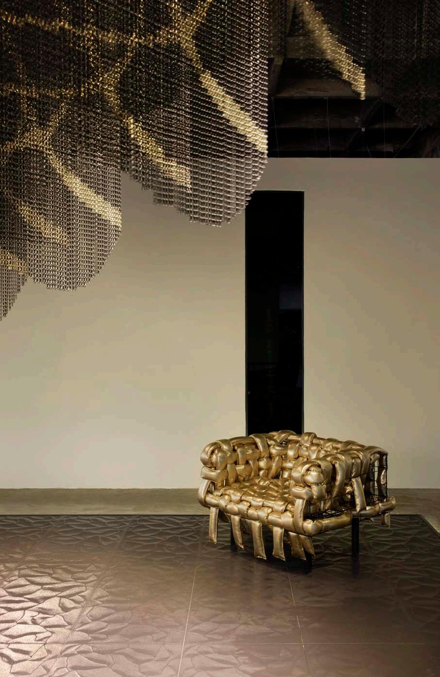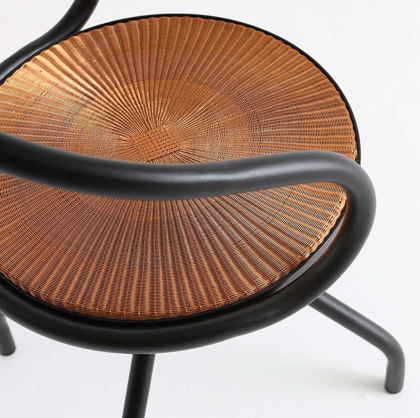 No lugar de madeiras curvadas, têm-se perfis metálicos tubulares e, no lugar dos trançados de palha feitos à mão, têm-se o trabalho do Sr. José, artesão paulista, e sua técnica tradicional de trançar fios de cobre.