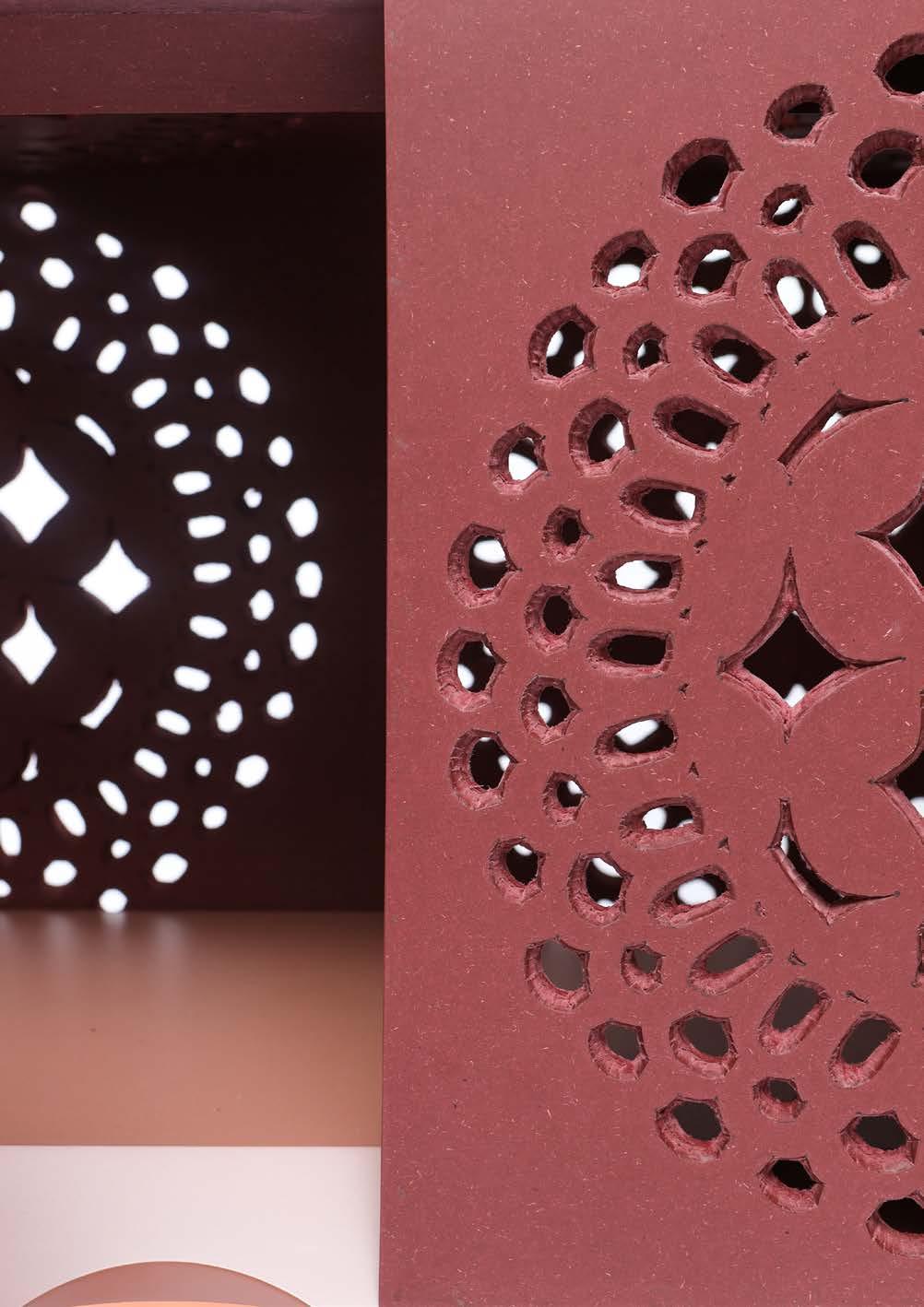 Um armário que parece rendado, feito à mão, trata-se, na verdade, de uma chapa de metal cortada a laser mimetizando as rendas e curvada à mão a partir de diversas técnicas brasileiras dos chapeiros automotivos brasileiros.