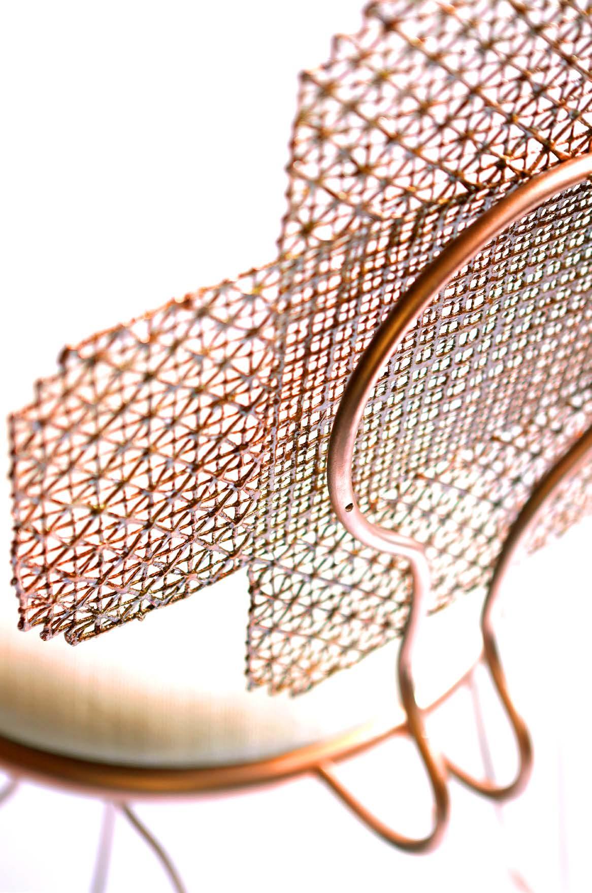 The piece is a tribute to the first designer in history, Michael Thonet (1796-1871). Instead of curved woods, there are tubular metal profiles, and instead of hand-woven straw weavings, there is the work of Mr. José, a craftsman from São Paulo, and his traditional technique of weaving copper wires.