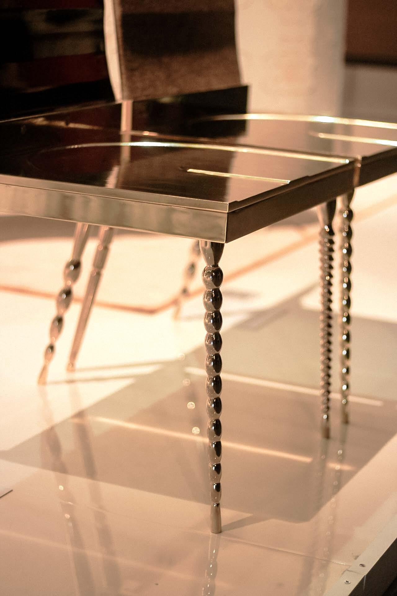 No tampo da mesa, rendas feitas à mão por artesãos de diferentes localidades brasileiras. Essas rendas são enrijecidas pelo inédito processo de imersão em cobre, eternizando, assim, os saberes tradicionais brasileiros.