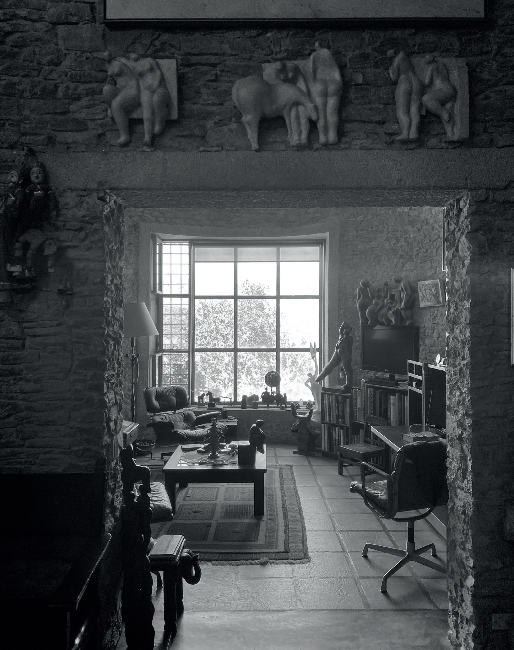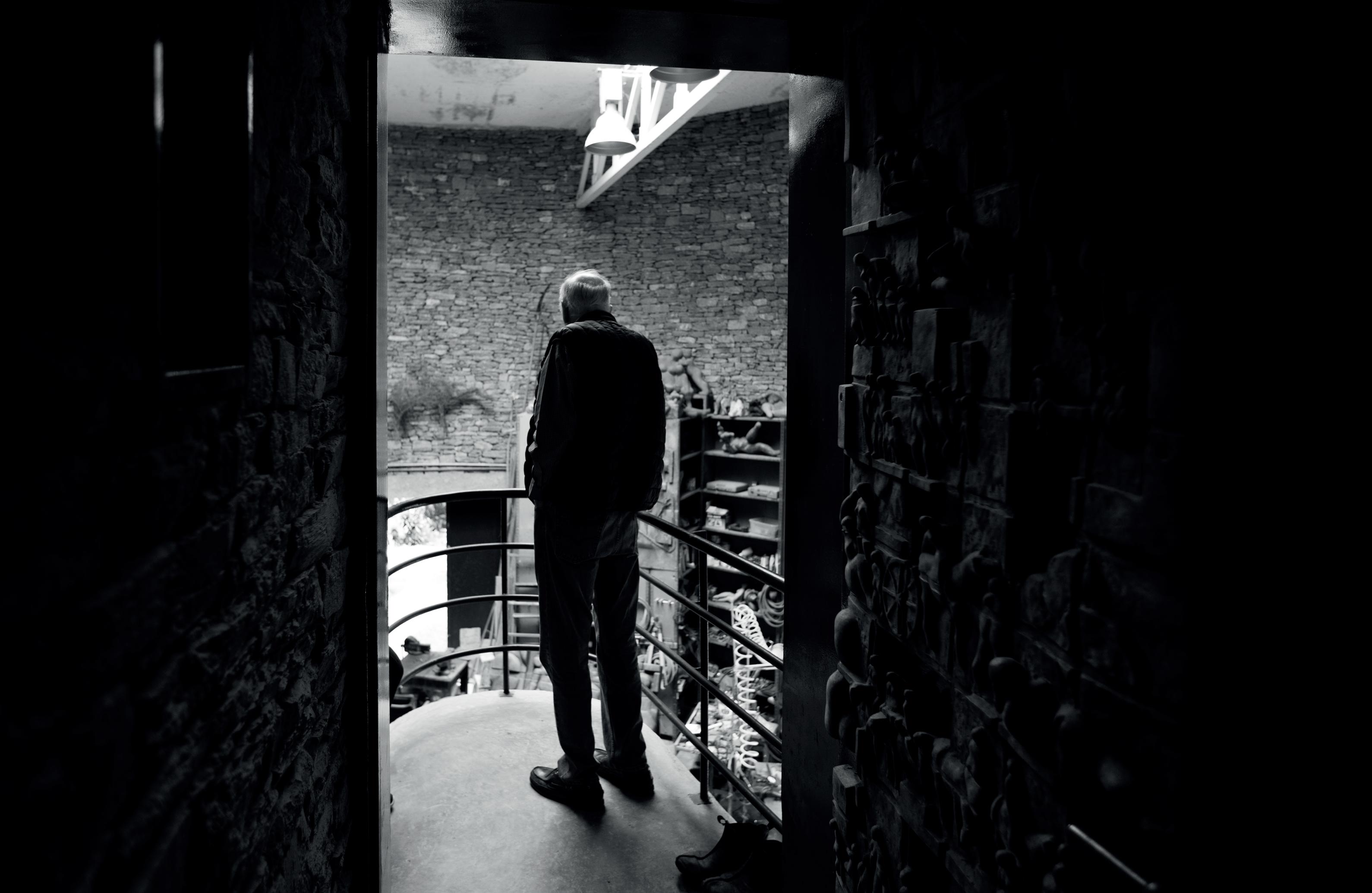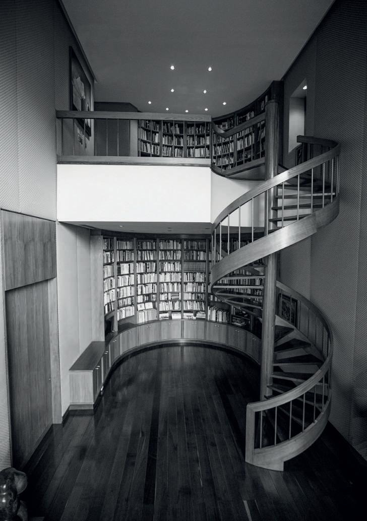 Se suman dos grandes puertas que abren al jardín, integrando las esculturas, terminadas y en proceso, al entorno. La comunicación entre la casa y el taller se realiza a través de una escalera curva, adosada a la pared, que une el espacio de trabajo y el espacio habitable.
