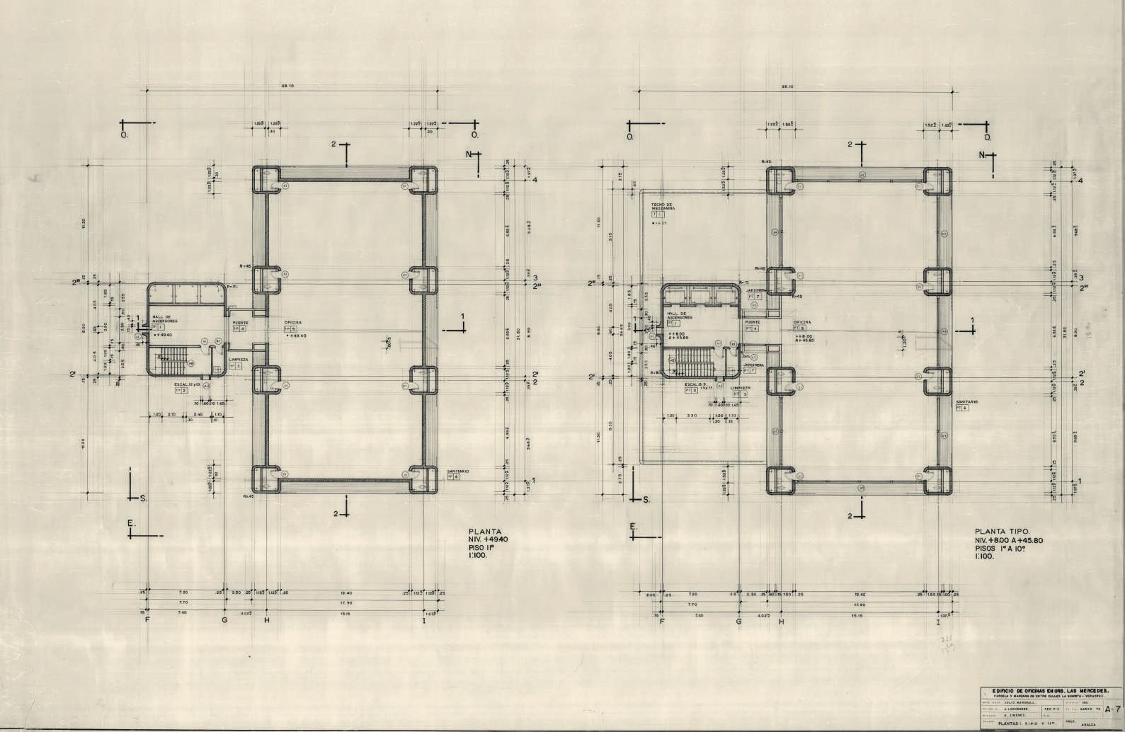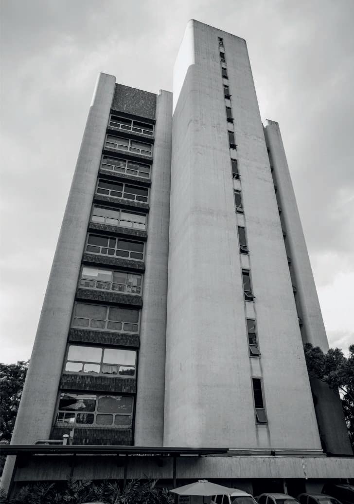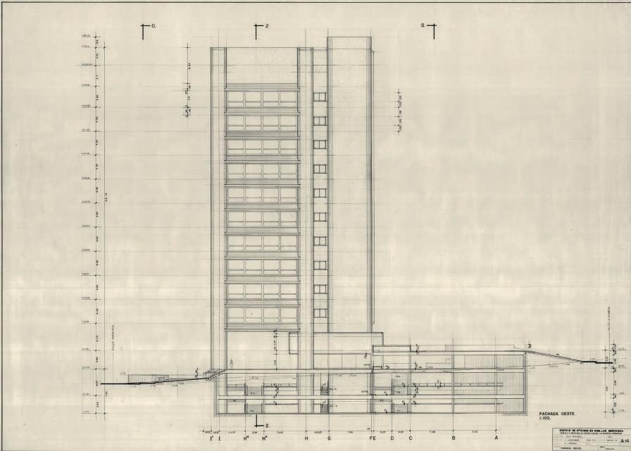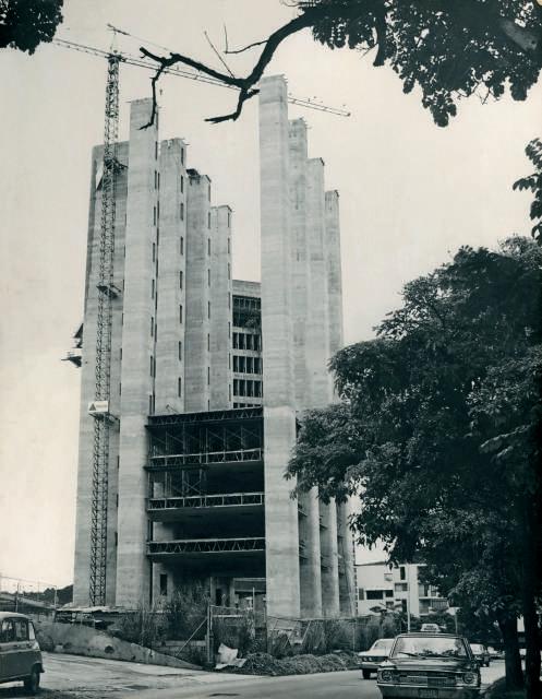 Esta torre fue diseñada en 1974 por el arquitecto Julio Maragall e inaugurada en 1975. En su construcción se utilizó un novedoso sistema estructural que permitía elevar la altura total de las columnas, de doce pisos, para después arriostrarlas con las losas prefabricadas en el sistema Tridilosa. Para las nueve columnas, vaciadas en concreto armado, se utilizaron encofrados metálicos deslizantes. Ocho columnas configuran el soporte estructural del edificio. En la novena, la columna-torre de mayor tamaño, se ubican los ascensores y las escaleras. Este sistema estructural solo permitió redondear los ángulos de las columnas, dando prioridad a las rectas y a la iluminación necesaria para las oficinas. En la planta baja, de una gran doble altura, se instaló la Ambientación cromática de Carlos Cruz-Diez, (11 x 40 metros), suspendida del techo.